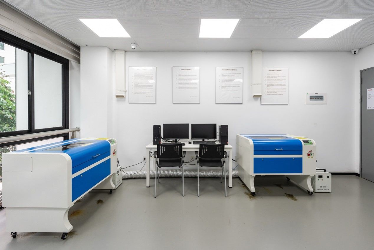 数字制造空间包含激光切割室和数控机床室,是融合数字化设计与实体制作为核心的综合制造空间,服务于产品设计、工业设计、环境设计等专业教学与创作实践。工坊配备高精度激光切割机、CNC数控雕刻系统及配套冷却装置,可对亚克力、木材、复合材料等多种材料进行精密加工。空间设有标准化操作台与材料管理区,配备安全标识、防护装置及集尘系统,确保操作规范与环境清洁。