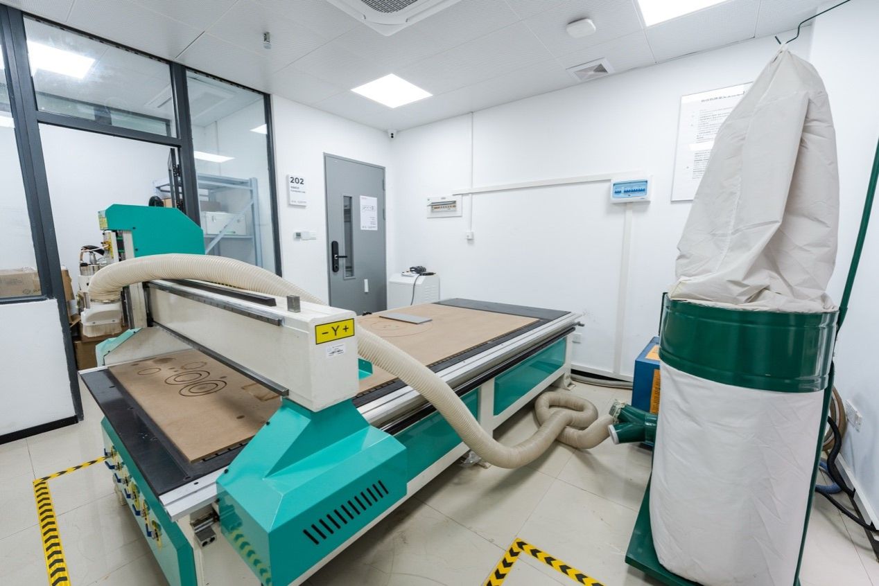 The Digital Fabrication Space integrates digital design with physical making to support programs in product, industrial, and environmental design. Comprising a laser cutting room and a CNC room, the facility is equipped with high-precision laser cutters, CNC milling systems, and supporting cooling units. This enables the accurate processing of acrylic, wood, and composite materials. Standardized workstations, material management zones, and dust extraction systems ensure a safe, efficient, and clean working environment..