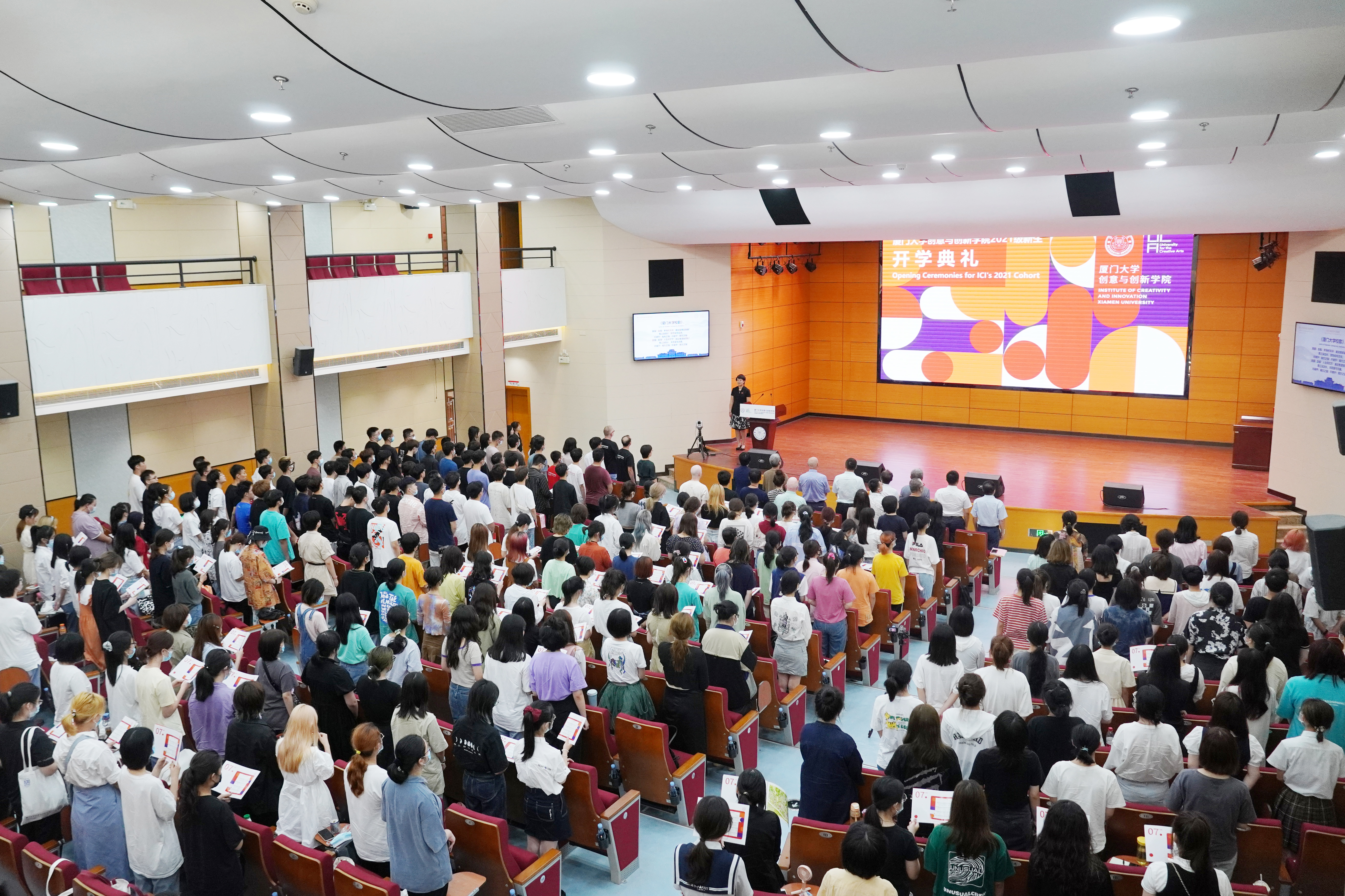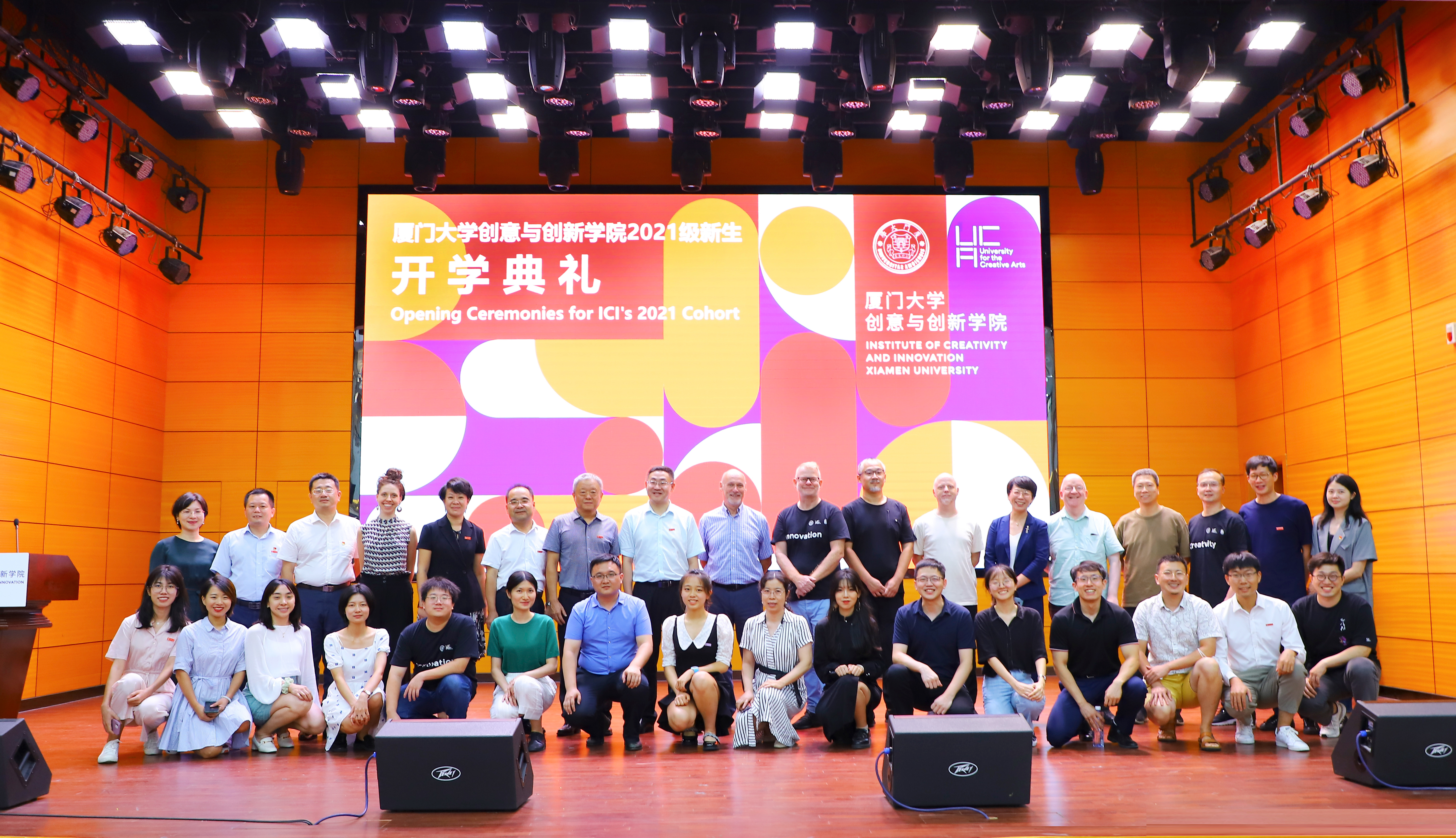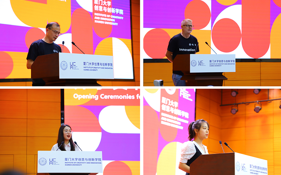 On September 10th, the Institute of Creativity and Innovation (ICI) of Xiamen University (XMU) held an opening ceremony for the Year 2021 freshmen. Nearly 250 freshmen from all corners of the country gathered together, and the youthful smiles brightened the autumn of Zhangzhou campus, XMU. Prof. Fang Ying, Assistant President of XMU and Prof. Simon Macklin, Pro Vice-Chancellor of the University for the Creative Arts (UCA) attended the ceremony and delivered speeches. The ceremony was also attended by Mr. LI Yongqiang, Director of the Management Committee of XMU Zhangzhou Campus, Mr. YANG Yang, Deputy director, council committee members of ICI and a team of XMU and UCA tutors and staff. WANG Yi, chair of ICI council, presided over the opening ceremony.