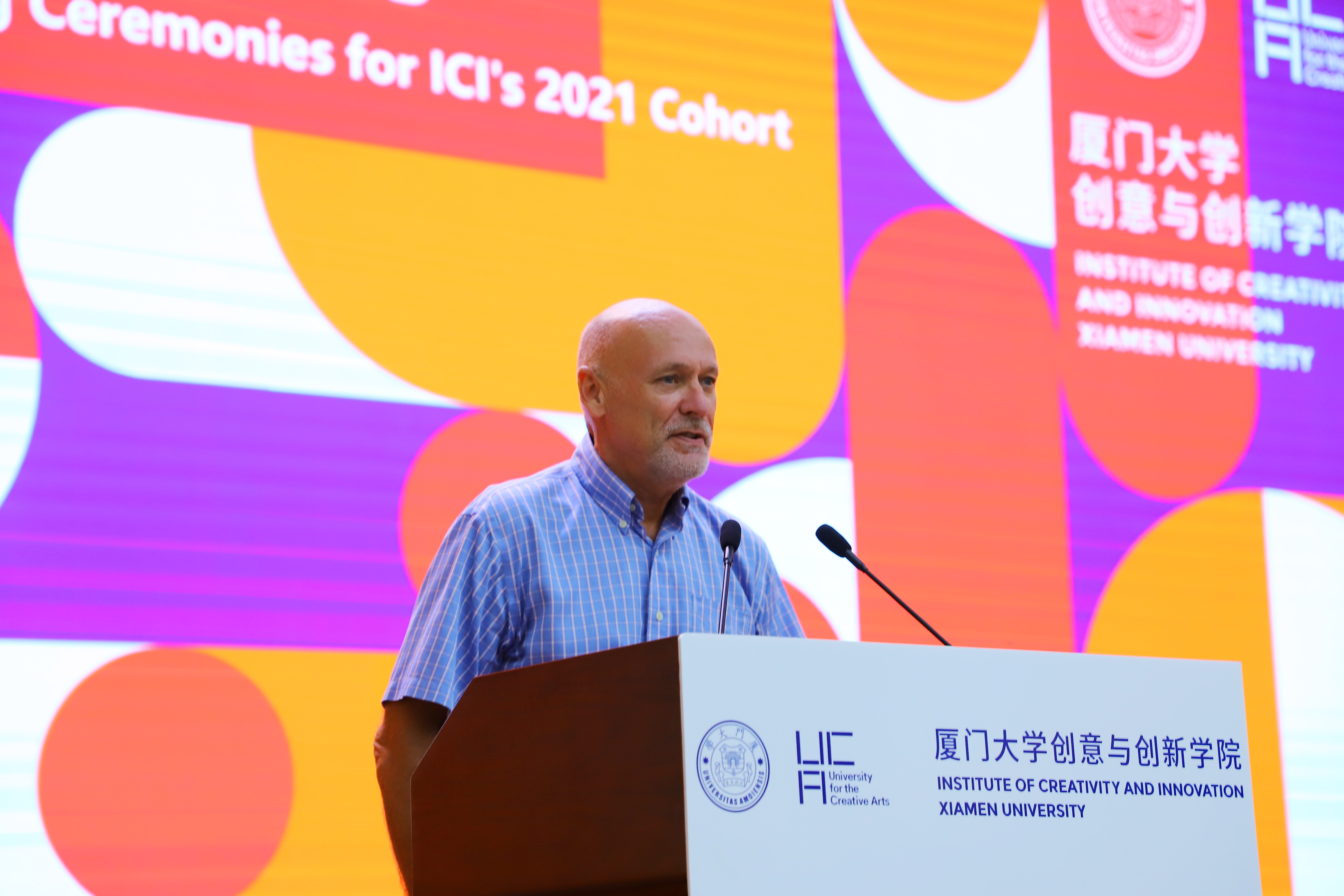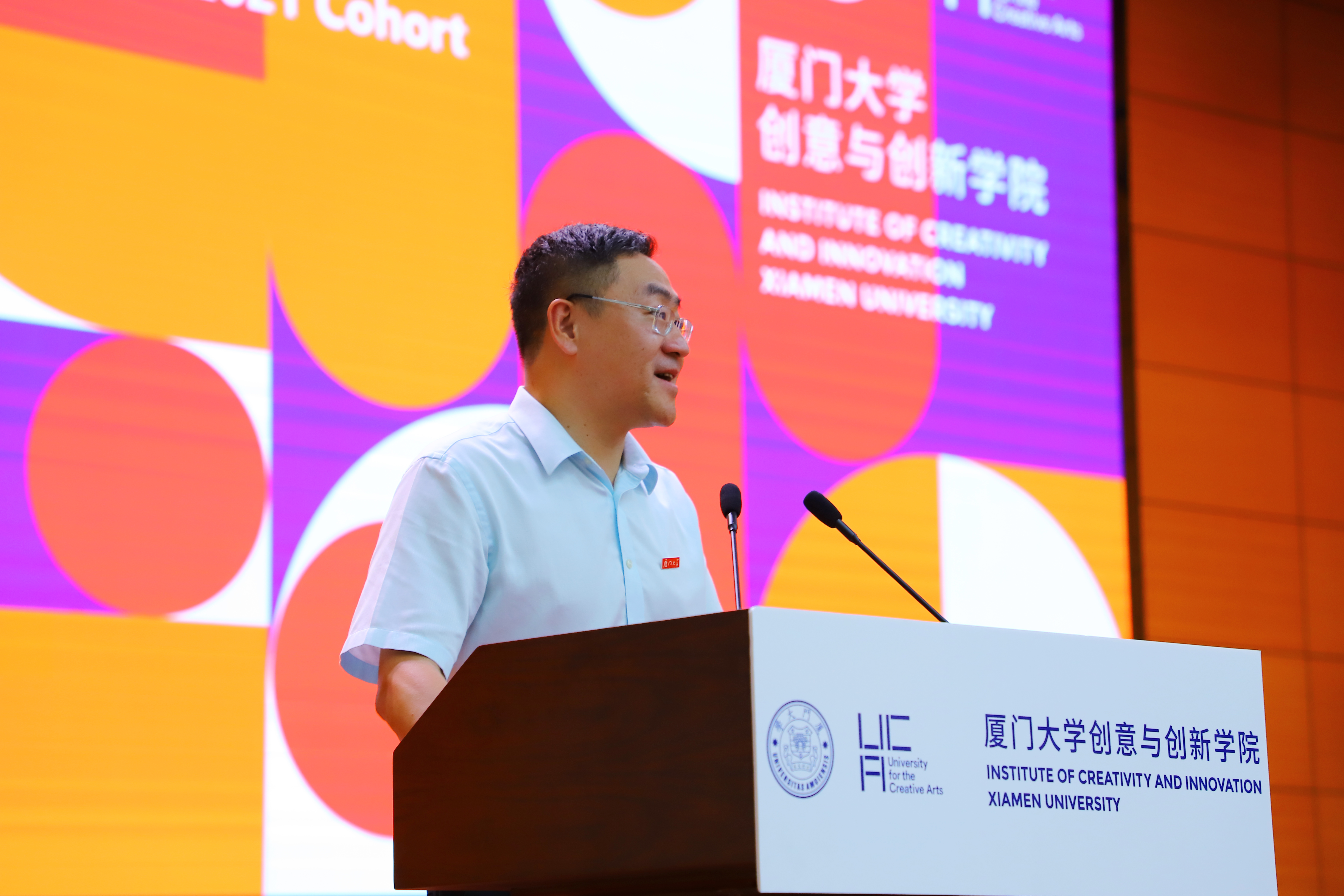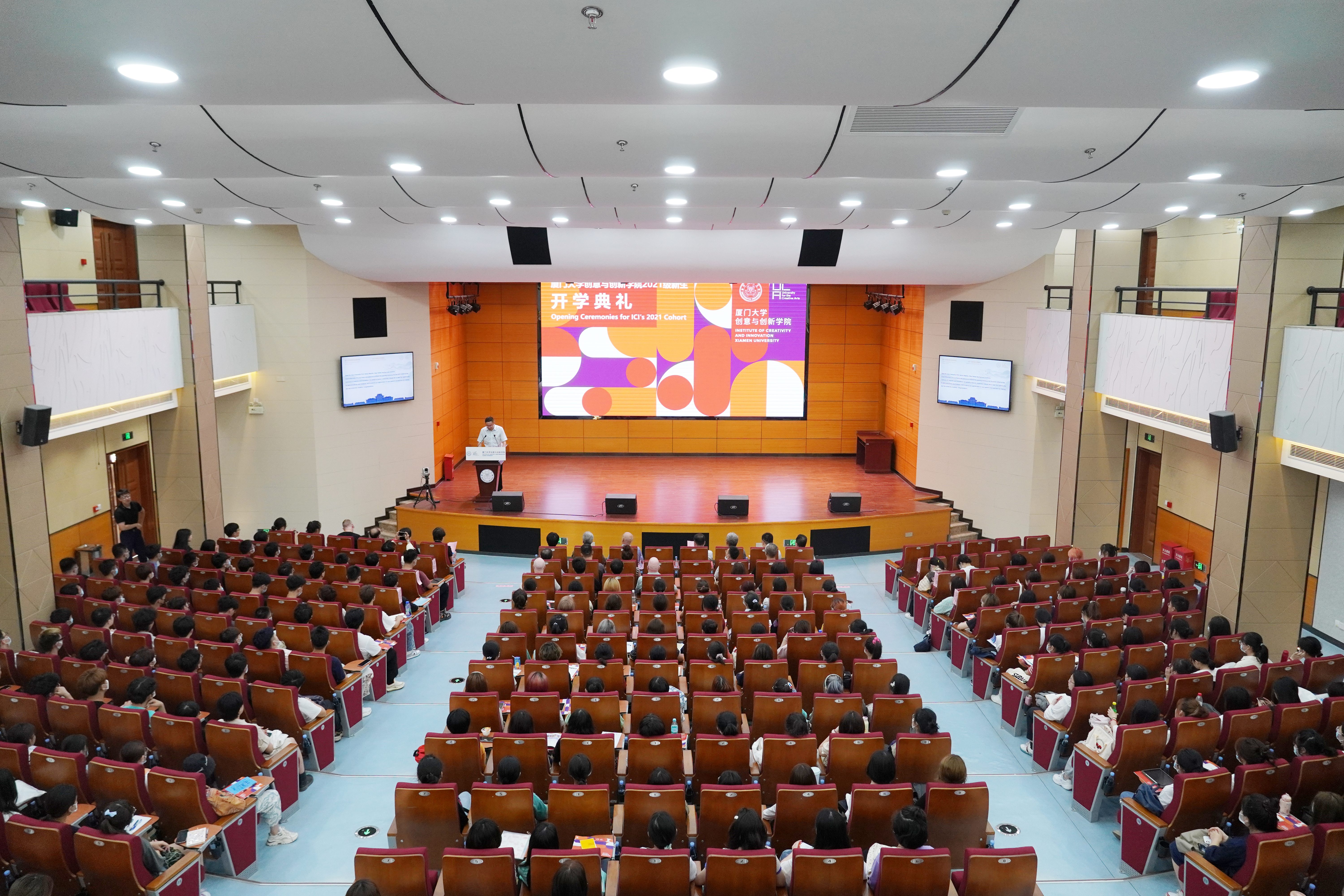 On September 10th, the Institute of Creativity and Innovation (ICI) of Xiamen University (XMU) held an opening ceremony for the Year 2021 freshmen. Nearly 250 freshmen from all corners of the country gathered together, and the youthful smiles brightened the autumn of Zhangzhou campus, XMU. Prof. Fang Ying, Assistant President of XMU and Prof. Simon Macklin, Pro Vice-Chancellor of the University for the Creative Arts (UCA) attended the ceremony and delivered speeches. The ceremony was also attended by Mr. LI Yongqiang, Director of the Management Committee of XMU Zhangzhou Campus, Mr. YANG Yang, Deputy director, council committee members of ICI and a team of XMU and UCA tutors and staff. WANG Yi, chair of ICI council, presided over the opening ceremony.