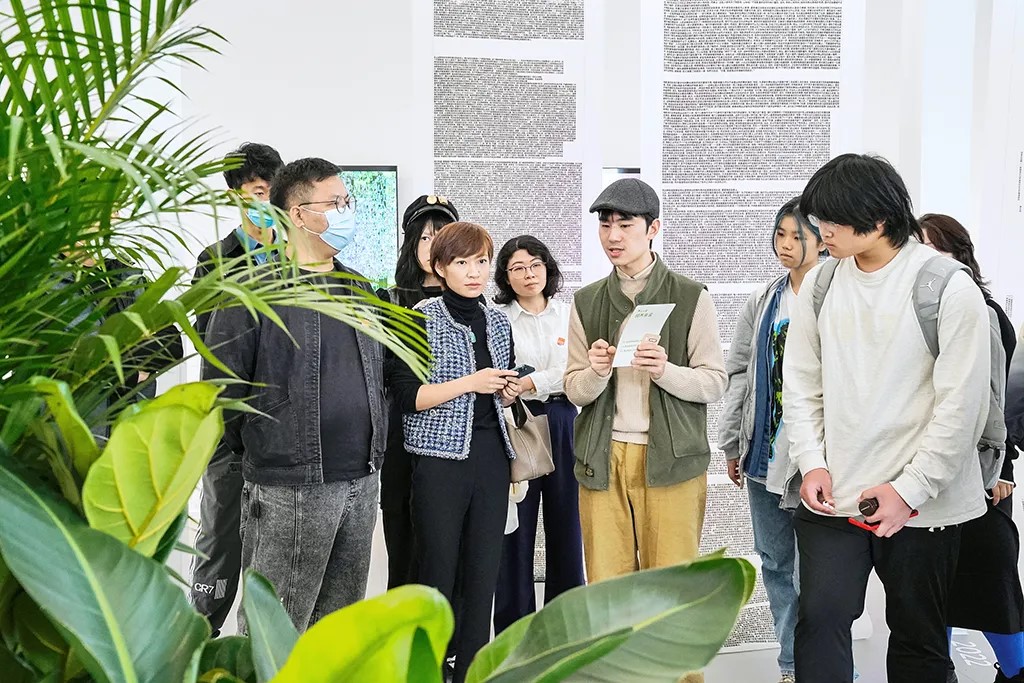Subsequently, the teaching assistant Zhang Ziyu led the guests to the exhibition works. The exhibition guide introduced the curatorial ideas and design concepts of the exhibition, as well as the creating background, logic, and presentation methods of the works on display. The works displayed in this exhibition were created by 19 young artists and designers from domestic art and design colleges. The 11 pieces/sets of works on display cross the boundaries of multiple disciplines, including visual arts, design, sociology, psychology, biology, etc., and are presented in multi-dimensional media such as images, sounds, installations, paintings, posters, etc. The themes of the works are inclusive, encompassing retrospections of the past, reflections on current issues, and visions of the future world.