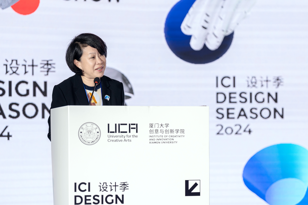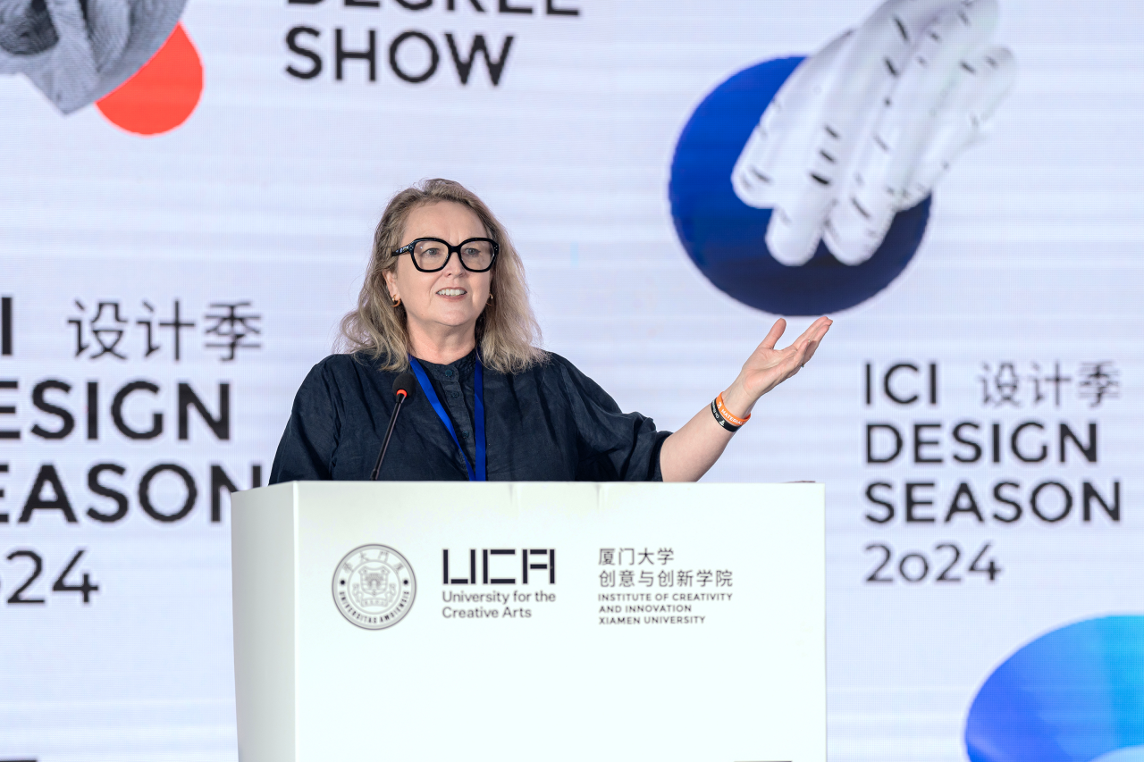 Marie Brennan, representative of the British side, then delivered a speech, in which she stated that ICI graduates had embraced challenges and failures, and come out with inventive and impactful solutions. She also mentioned that ICI faculty and staff were from very diverse background featuring 17 different nations. She commented that the Degree Show paid tribute to the transformative power of creativity, innovation, and design. As one of the curatorial directors, she expressed that she was deeply moved by the professionalism and dedication of the curatorial team, faculty, discipline leaders, program directors, and other officials, as well as the creativity of all teachers and students.
