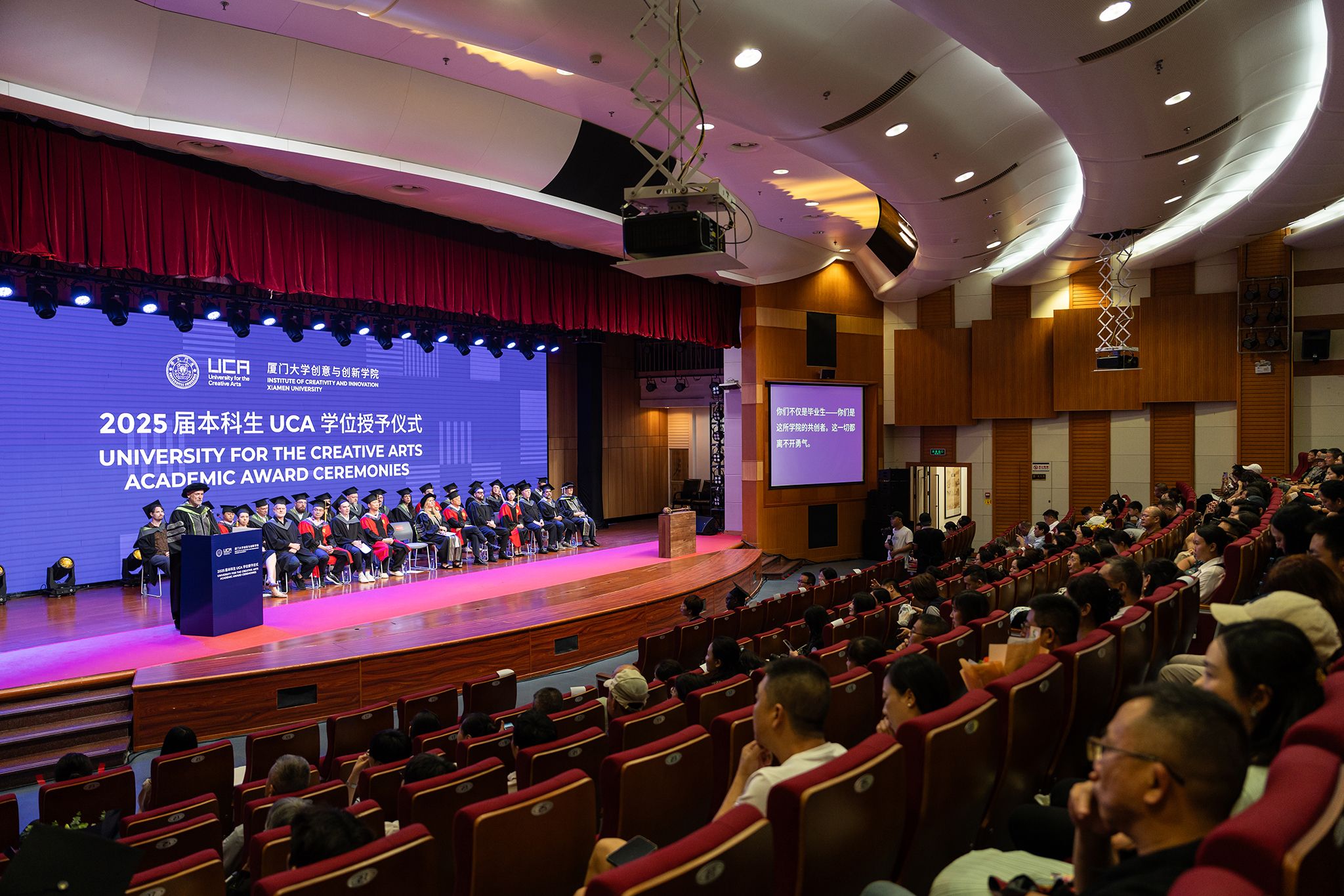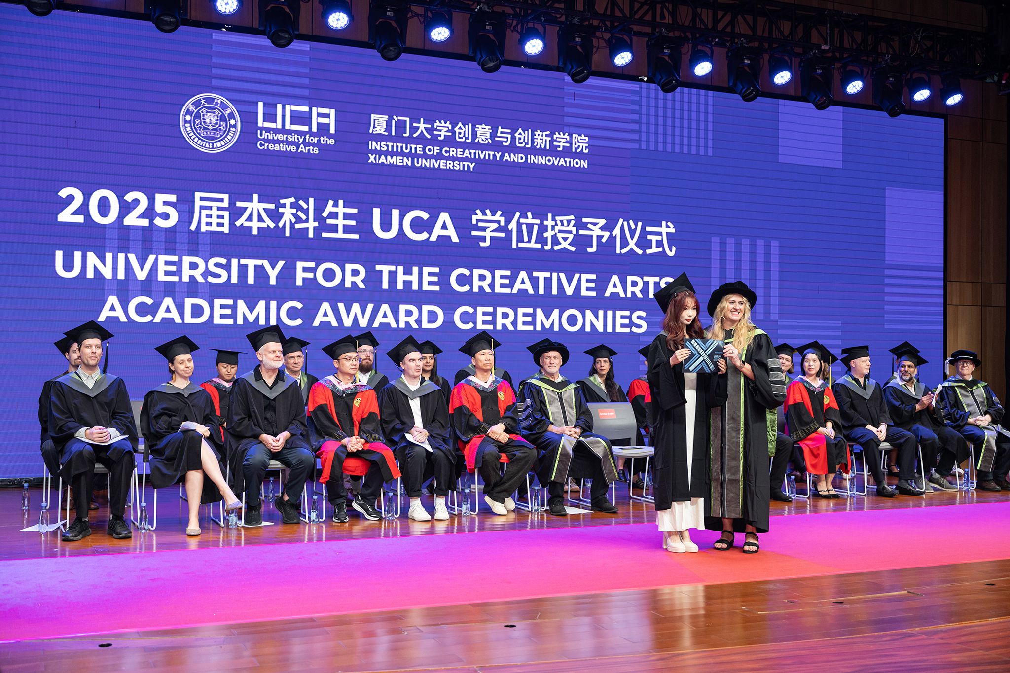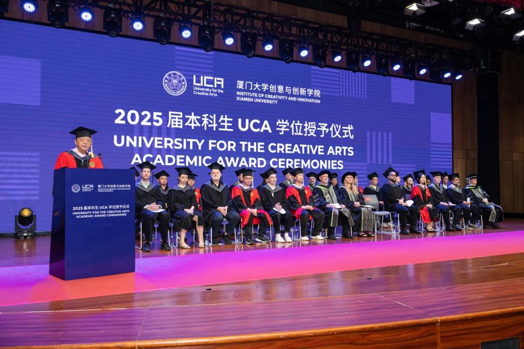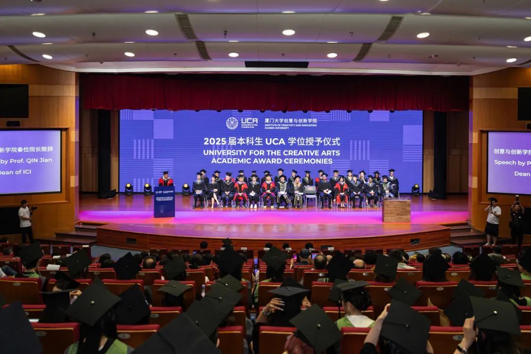On the morning of 25 June, the University for the Creative Arts (UCA) Academic Award Ceremonies were held for the Class of 2025 of the Institute of Creativity and Innovation (ICI) at the main hall of Building 3 at XMU's Zhangzhou Campus. The solemn ceremonies blended the distinctive characteristics of both universities, creating a harmonious fusion of Eastern and Western elements and marking a perfect finale to the undergraduate journeys for the inaugural cohort of Digital Media Art course and the second cohort of graduates majoring in Visual Communication Design and Environmental Design courses.