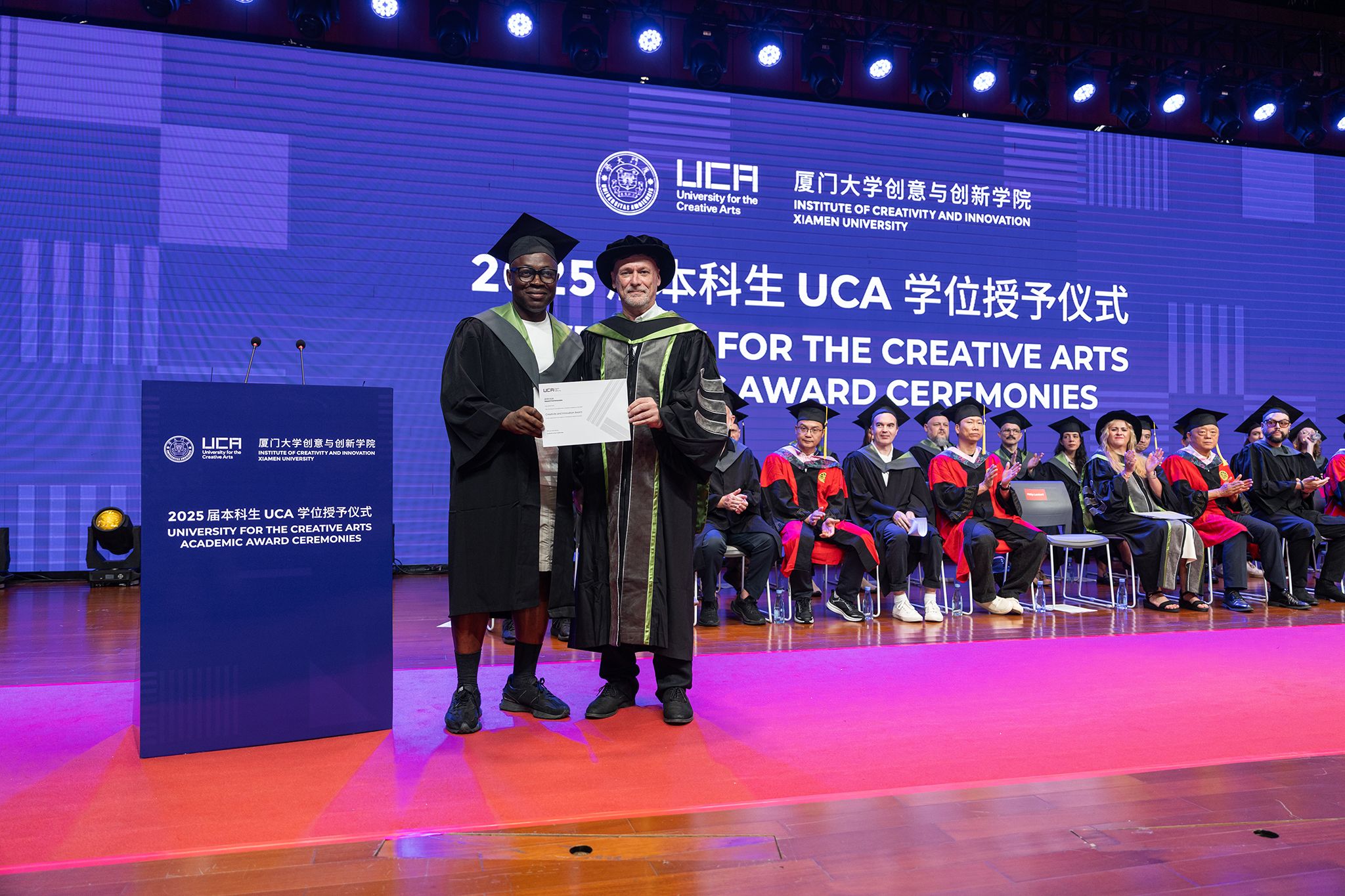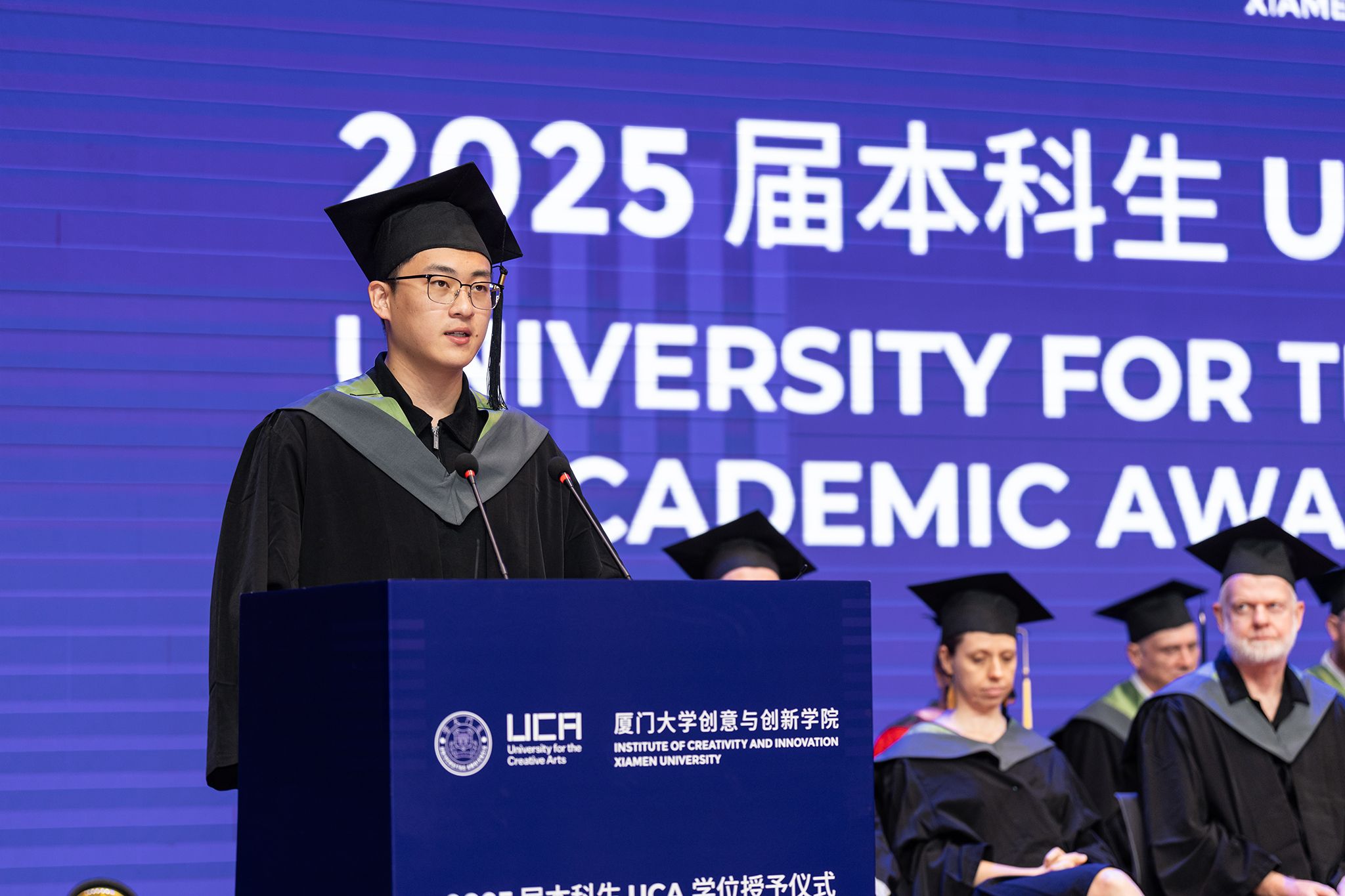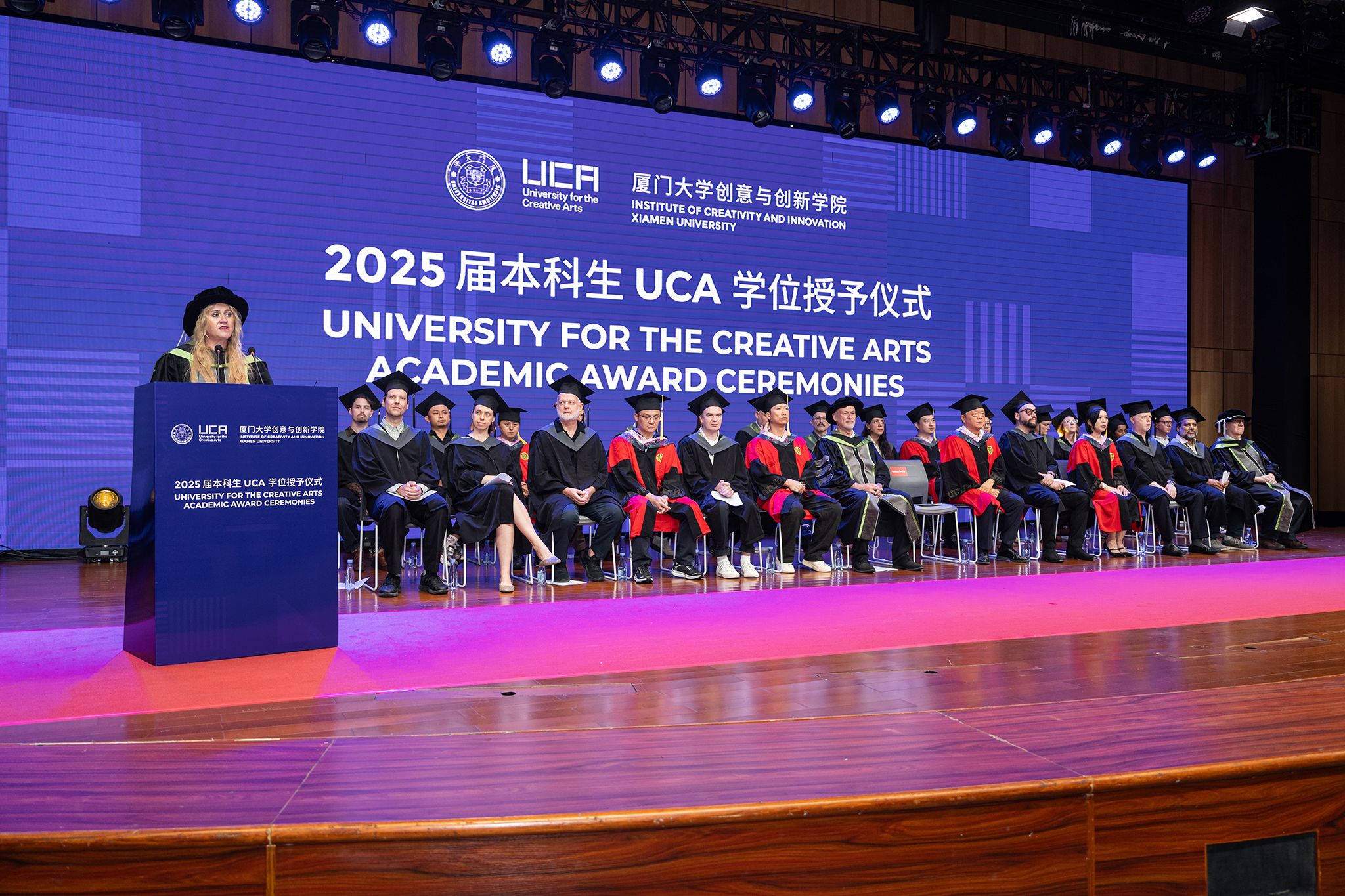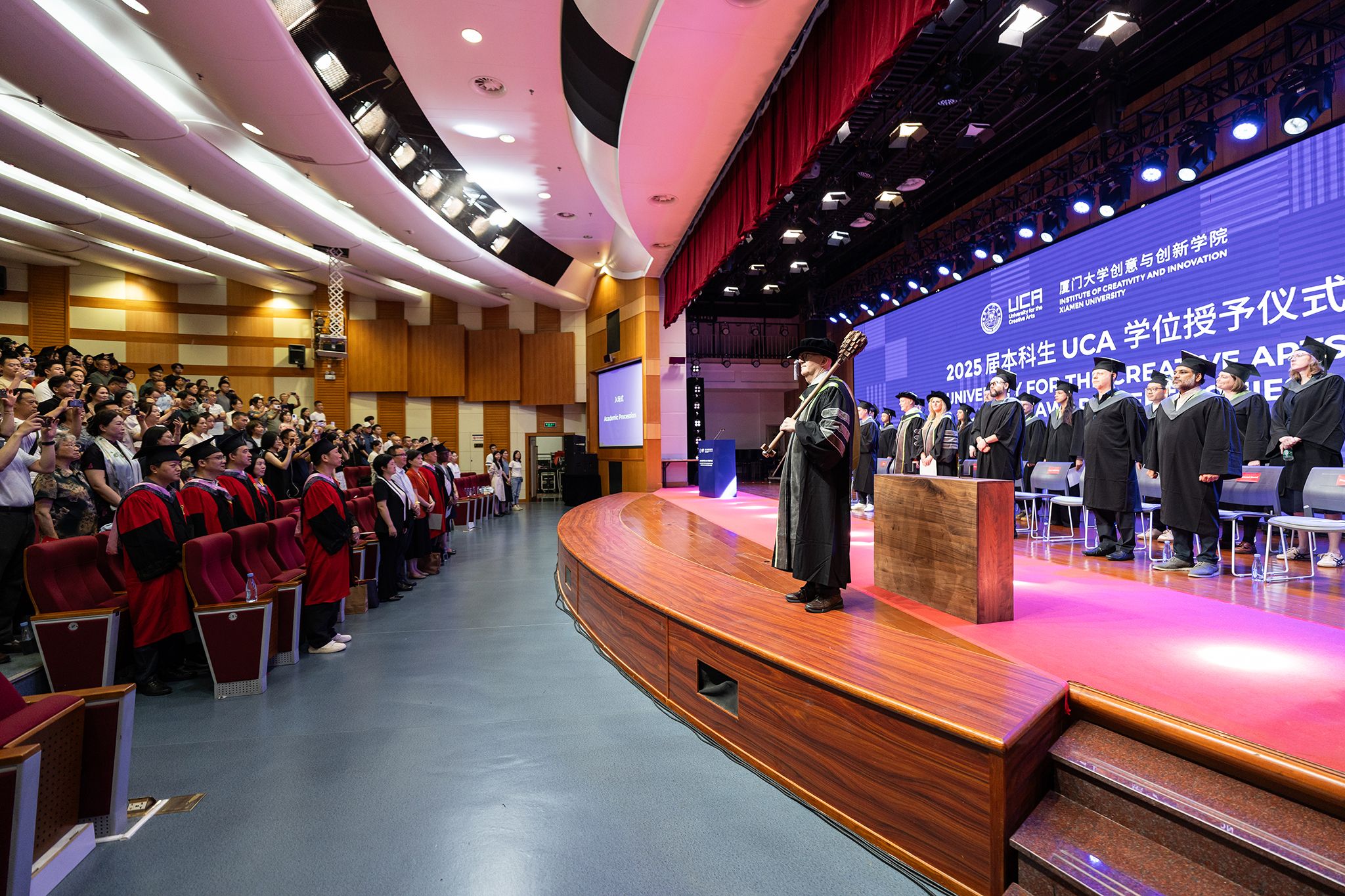 On the morning of 25 June, the University for the Creative Arts (UCA) Academic Award Ceremonies were held for the Class of 2025 of the Institute of Creativity and Innovation (ICI) at the main hall of Building 3 at XMU's Zhangzhou Campus. The solemn ceremonies blended the distinctive characteristics of both universities, creating a harmonious fusion of Eastern and Western elements and marking a perfect finale to the undergraduate journeys for the inaugural cohort of Digital Media Art course and the second cohort of graduates majoring in Visual Communication Design and Environmental Design courses.