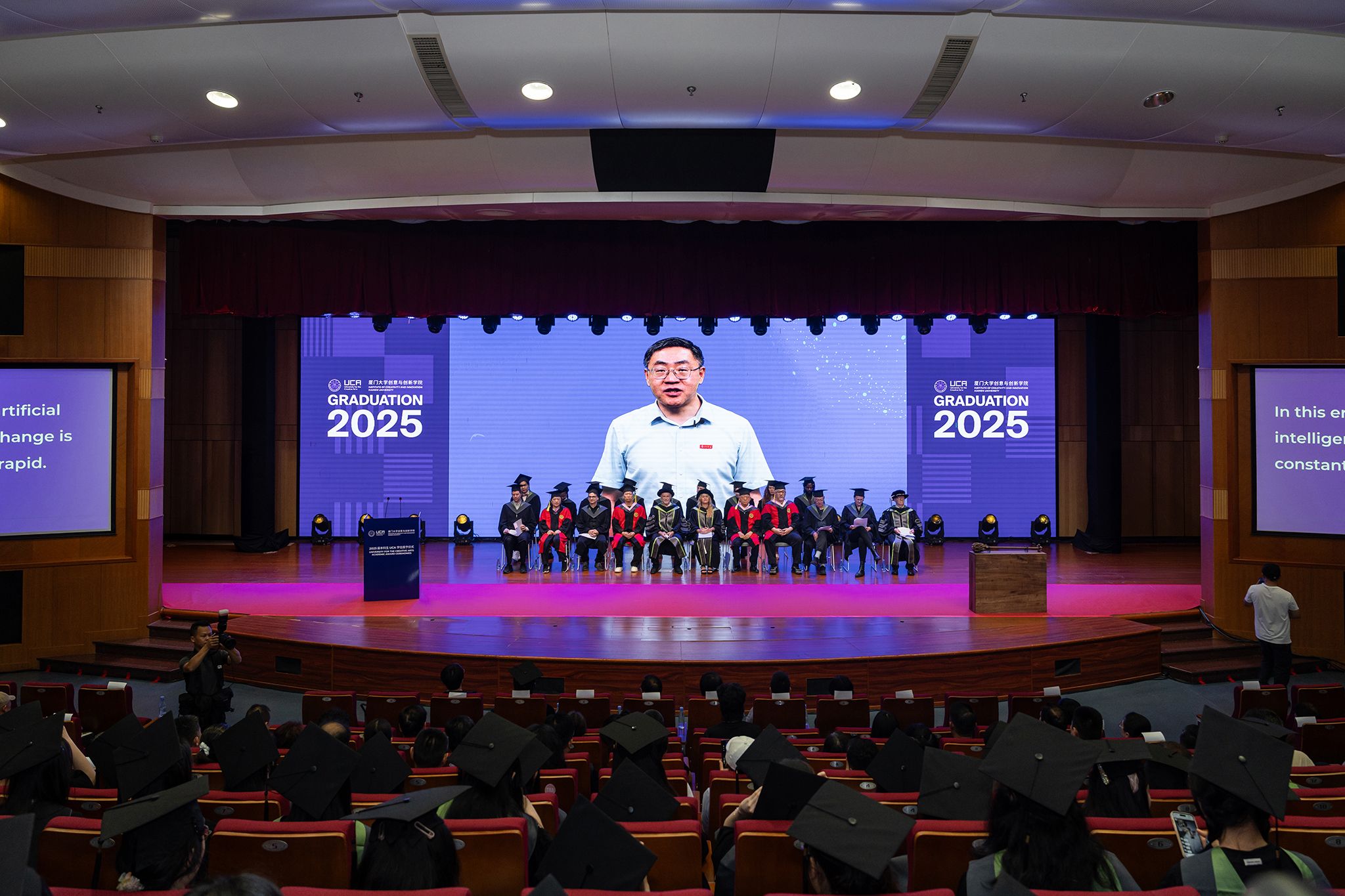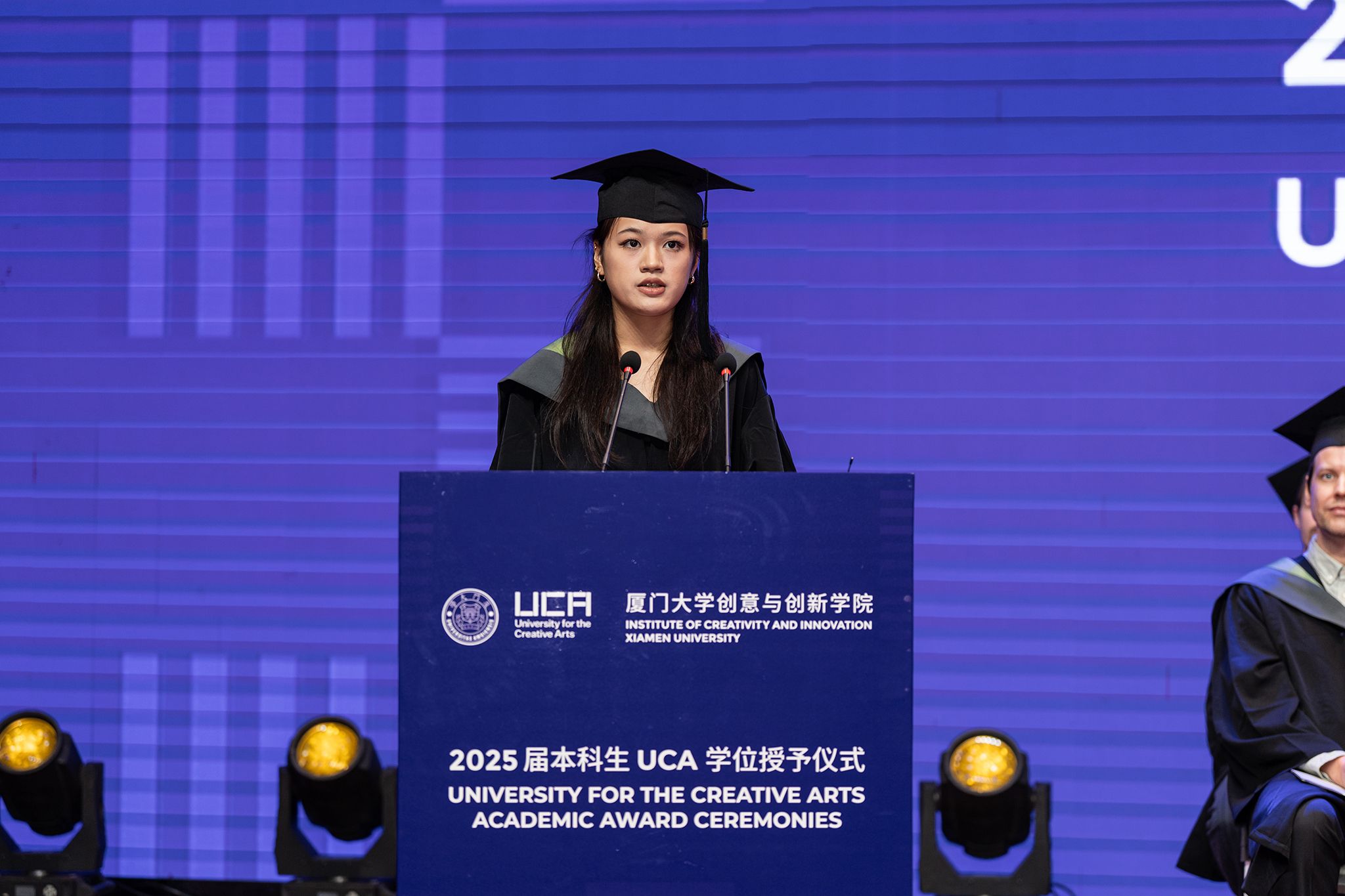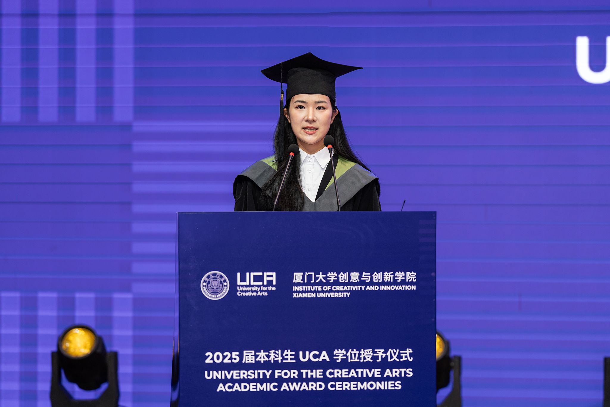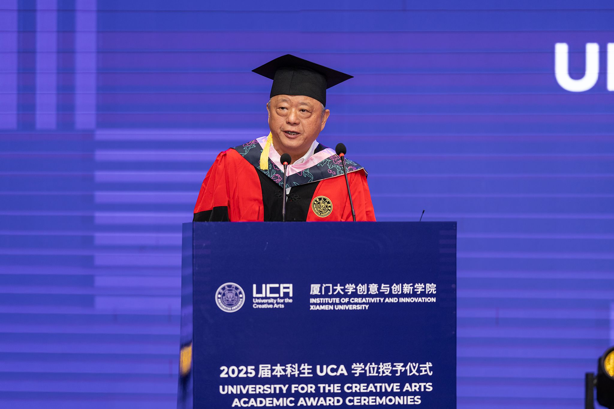 On the morning of 25 June, the University for the Creative Arts (UCA) Academic Award Ceremonies were held for the Class of 2025 of the Institute of Creativity and Innovation (ICI) at the main hall of Building 3 at XMU's Zhangzhou Campus. The solemn ceremonies blended the distinctive characteristics of both universities, creating a harmonious fusion of Eastern and Western elements and marking a perfect finale to the undergraduate journeys for the inaugural cohort of Digital Media Art course and the second cohort of graduates majoring in Visual Communication Design and Environmental Design courses.