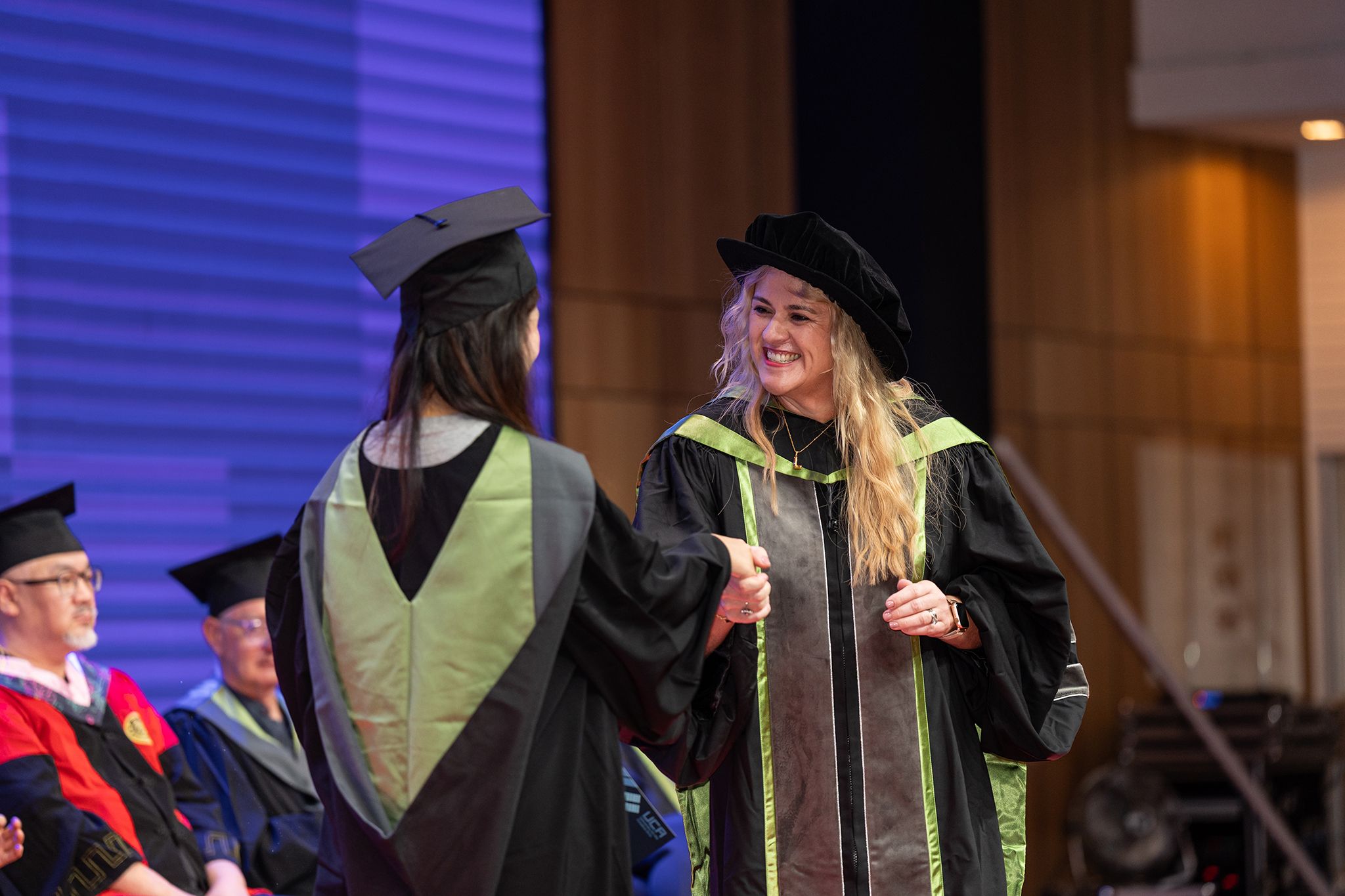 Subsequently, with the presence of guests, faculty members from both universities, the families and friends of graduates, and amidst warm applause, the 2025 graduates took the stage one by one. Pro Vice-Chancellor Lyndsay Duthie shook hands with each of them and conferred the UCA degree certificates.