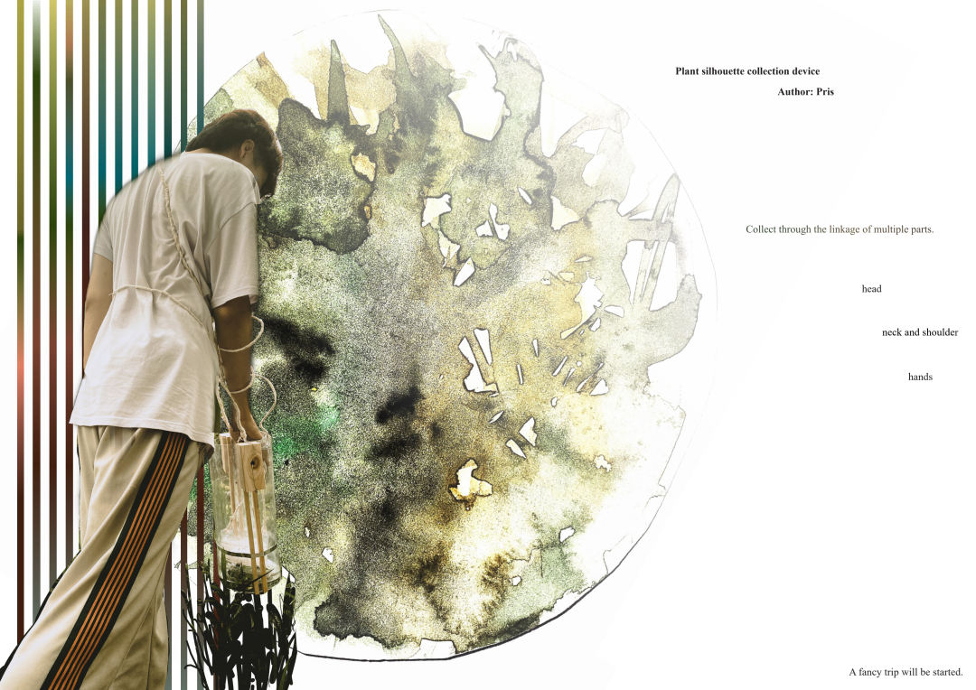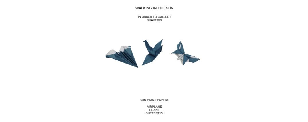 My device absorbs ultraviolet light from the sun by carrying blue paper folded into different shapes. Through the three folding methods of the thousand paper crane, the butterfly and the paper plane, after a day's walking, different creases and ultraviolet rays leave different shadow marks on the blue paper.