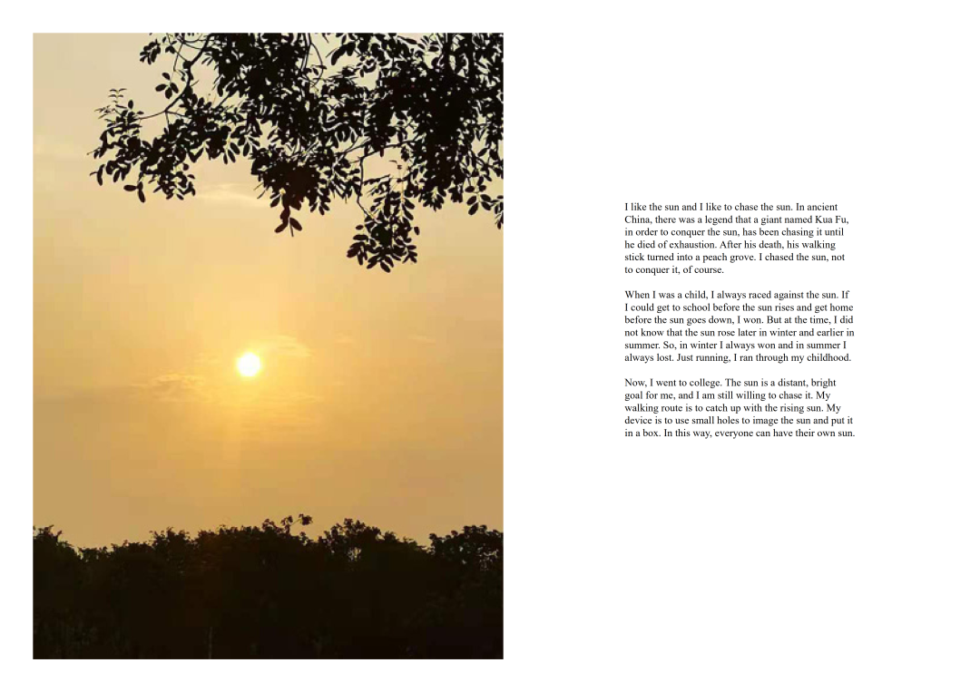 When I was a child, I always raced against the sun. If I could get to school before the sun rose and get home before the sun went down, I won. Just running, I ran through my childhood. My device is to use a small hole to project an image of the sun in to a box. In this way, everyone can have their own sun.