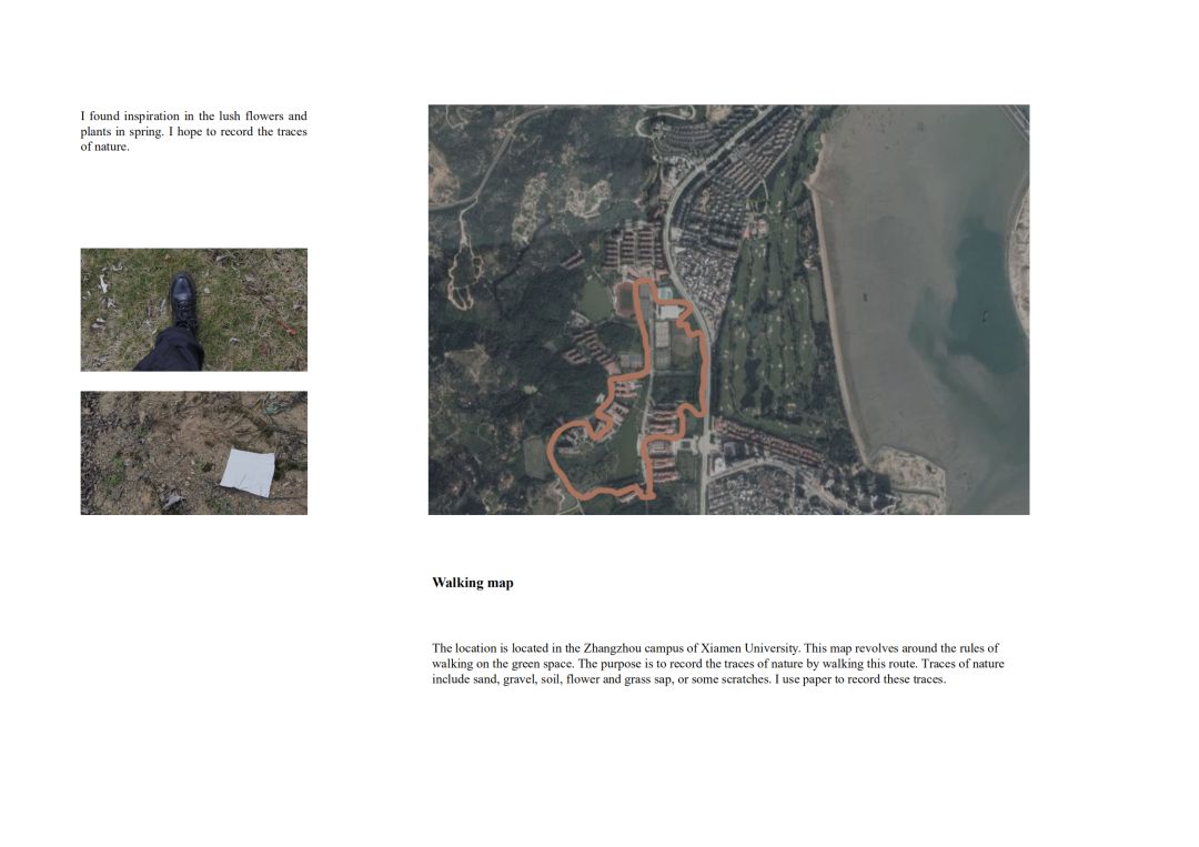 I am walking on the green field. The purpose is to find and record traces of nature.