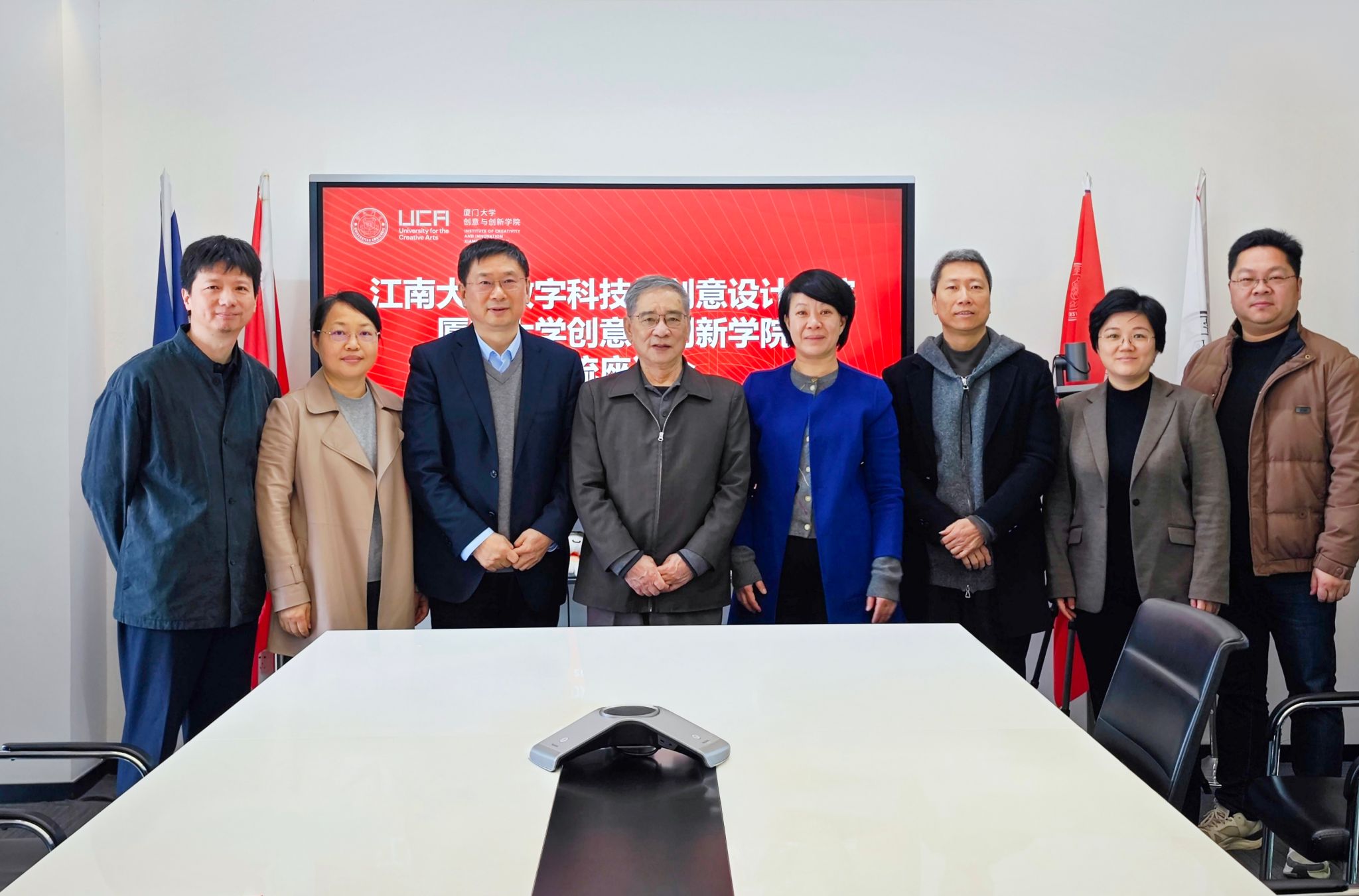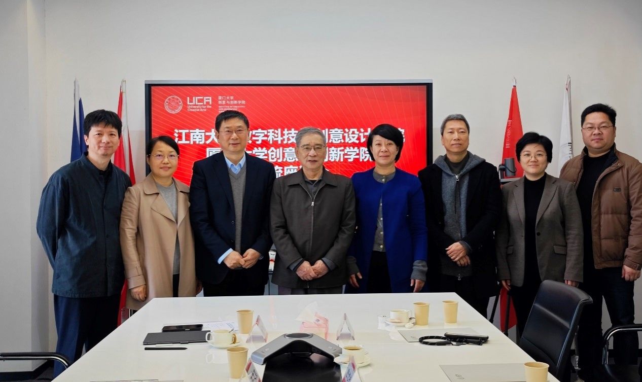 2026年2月2日上午,江南大学原副校长田备带队,江南大学国际交流处副处长蔡建英、数字科技与创意设计学院院长曹鸣、院长助理李剑等一行来访我院。学院党委书记王艺会见来宾并主持座谈,学院高级顾问陆懋祖、副院长甘森忠、何冬梅出席座谈。