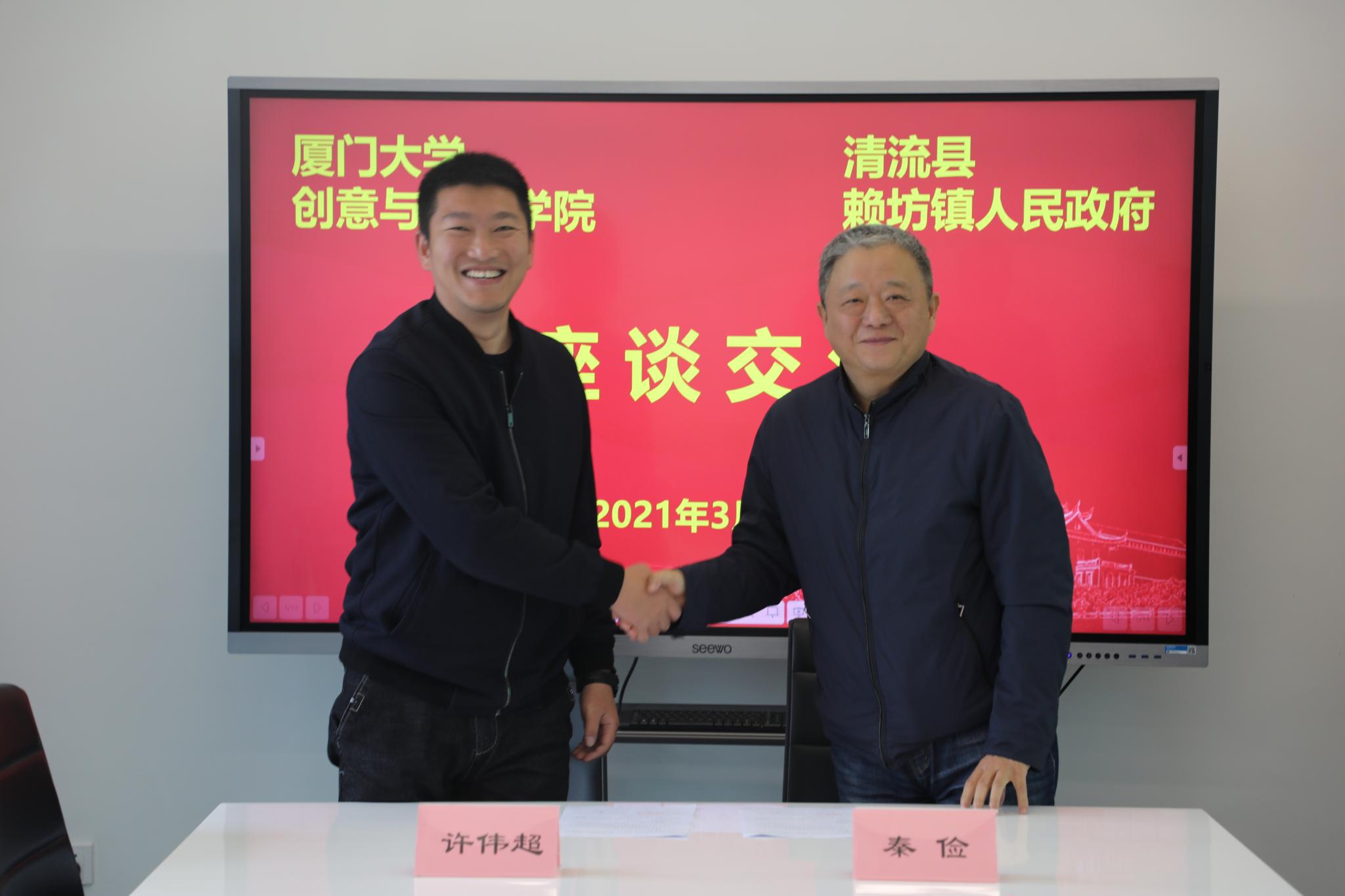 座谈会后,双方签订共建校外实践基地的协议,约定双方充分发挥各自优势,以赖坊镇深厚的历史文化资源和优越的自然环境作为创作元素,结合创意与创新学院的教育资源和学科优势,秉承优势互补、双赢互惠的原则,加快政产学研一体化,大力发展文化创意产业,打造学院和政府联合培养人才新机制。