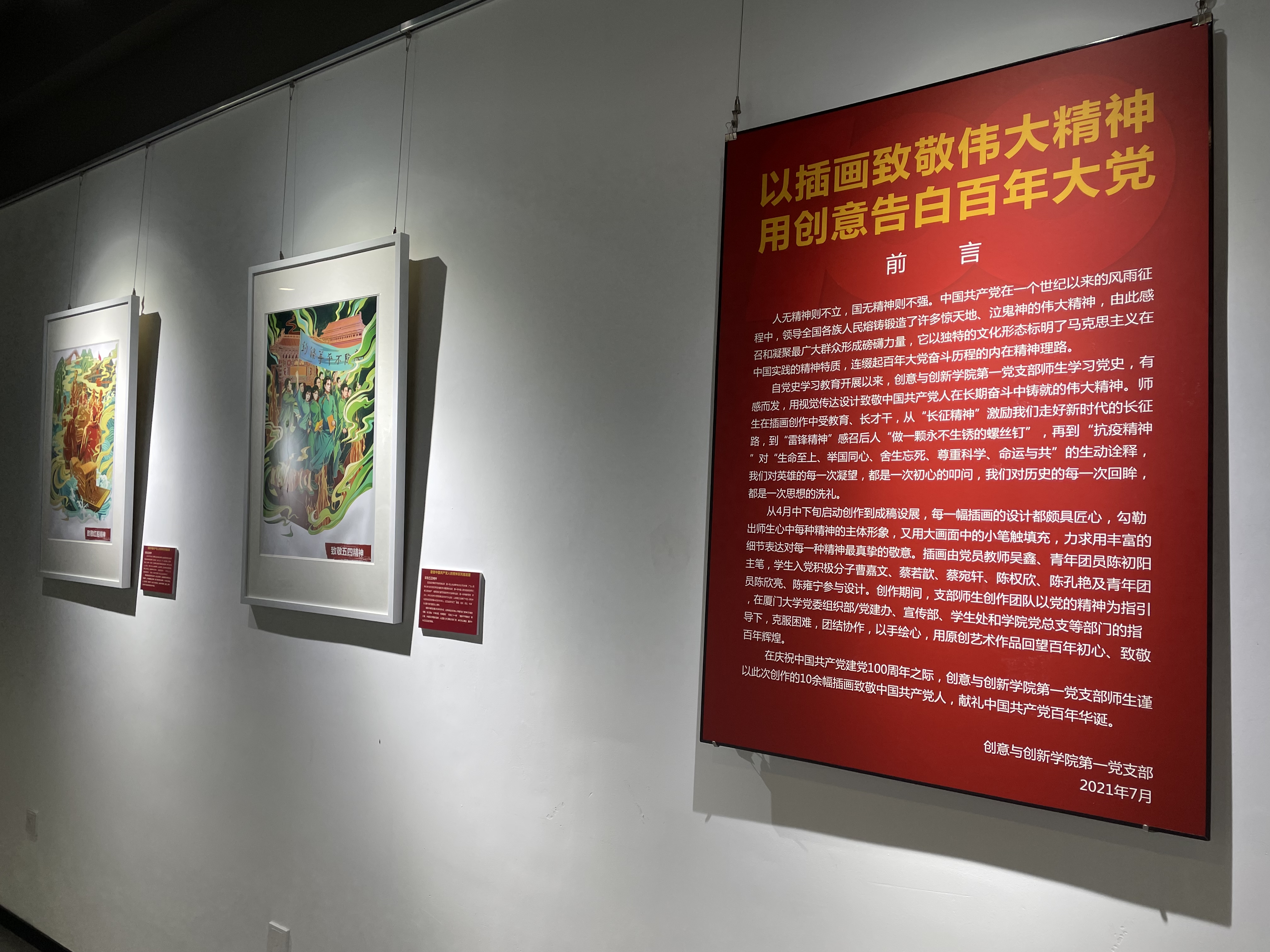由创意与创新学院第一党支部师生创作的“致敬中国共产党人的精神”系列插画展览近日在厦门大学漳州校区创意与创新学院大楼正式开展。开展当日,学校党史学习教育第五指导组组长杨敬达,创意与创新学院党总支书记王艺、第一党支部全体党员一同观展。