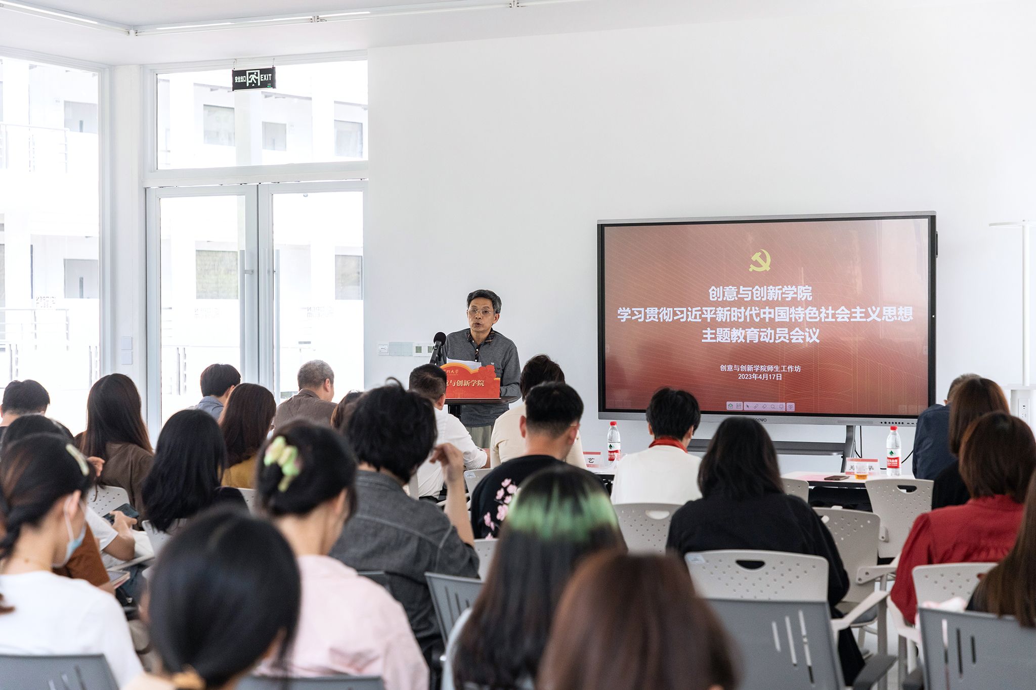 4月17日下午,创意与创新学院召开学习贯彻习近平新时代中国特色社会主义思想主题教育动员大会。学院党总支书记王艺主持会议并作动员讲话。学校第五巡回指导组组长郑建华到会指导并讲话。学院全体领导班子成员、全体师生党员参加会议。