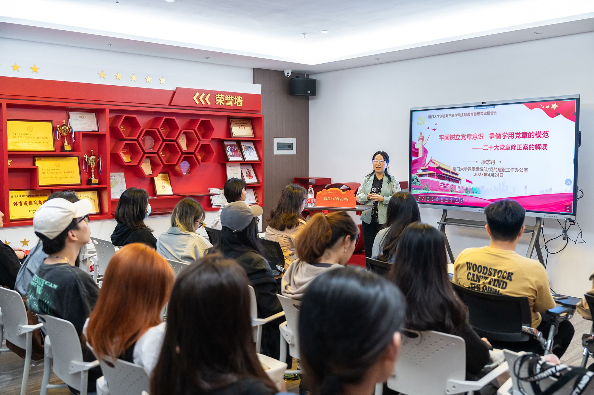 根据学院主题教育工作安排,4月24日,创意与创新学院主题教育首场专家辅导报告会在学院学术交流中心党团活动室举办。校党委党的建设工作办公室主任兼组织部副部长廖志丹副教授应邀作《牢固树立党章意识,争做学用党章的模范——二十大党章修正案的解读》专题辅导报告。学院理论学习中心组成员、全体师生党员、入党积极分子参加学习。报告会由学院党总支副书记庄淑娟主持。