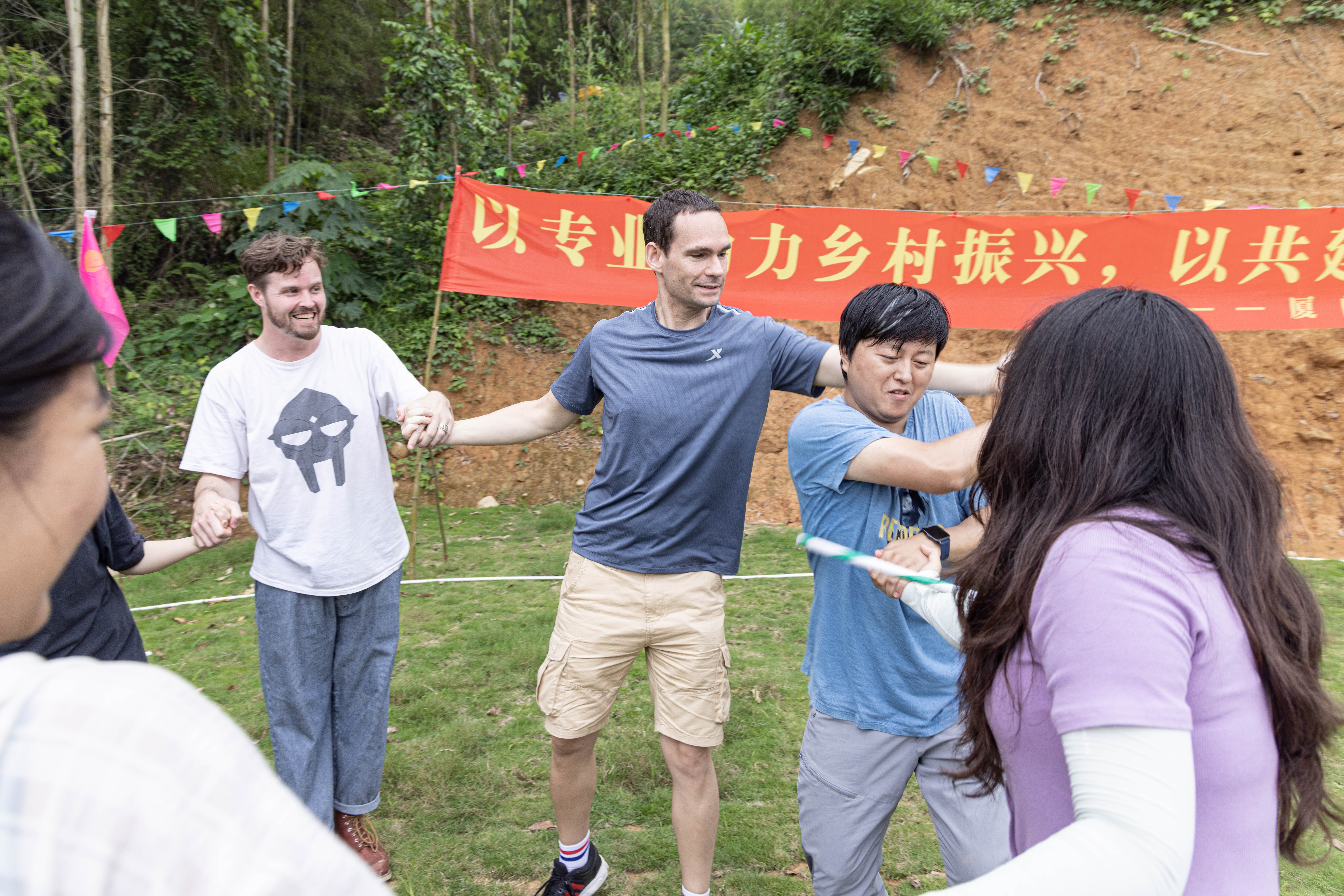 随后,中外教师一行来到店美村亨阳湖。茵茵绿草地上,“一圈”到底、气球接力赛等素质拓展活动相继开展,中外教师在协同作战、欢声笑语中充分增进了交流,凝聚了共识。
