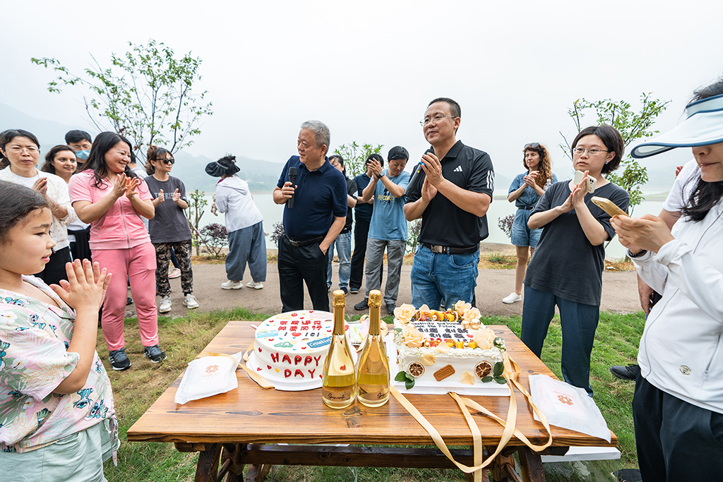 熟悉的厦门大学校歌声响起,老师们围聚在一起庆祝学院成立三周年。秦俭院长致辞,深情回顾三年来大家建设新学院的点滴过往,感谢每位老师的真诚付出,并对学院未来的发展充满信心。中外教师一同切蛋糕,举杯庆祝,其乐融融。