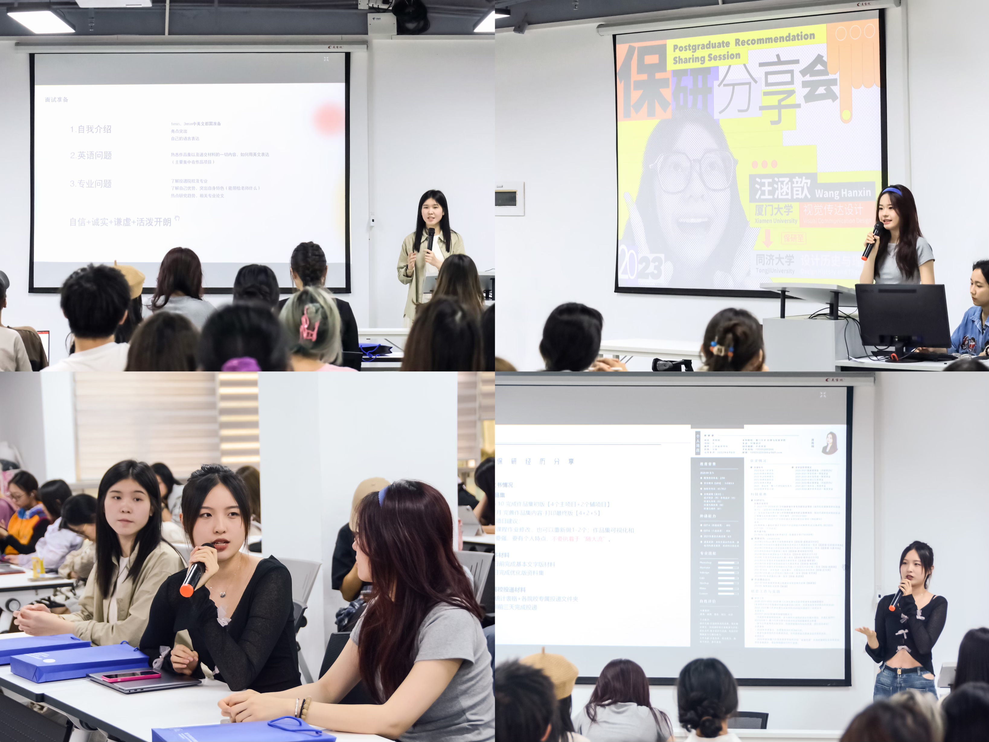 随后,视觉传达设计专业的汪涵歆(保送同济大学)分享了其个人的保研准备和参加夏令营的经历,强调了成绩、英语和作品集的重要性。