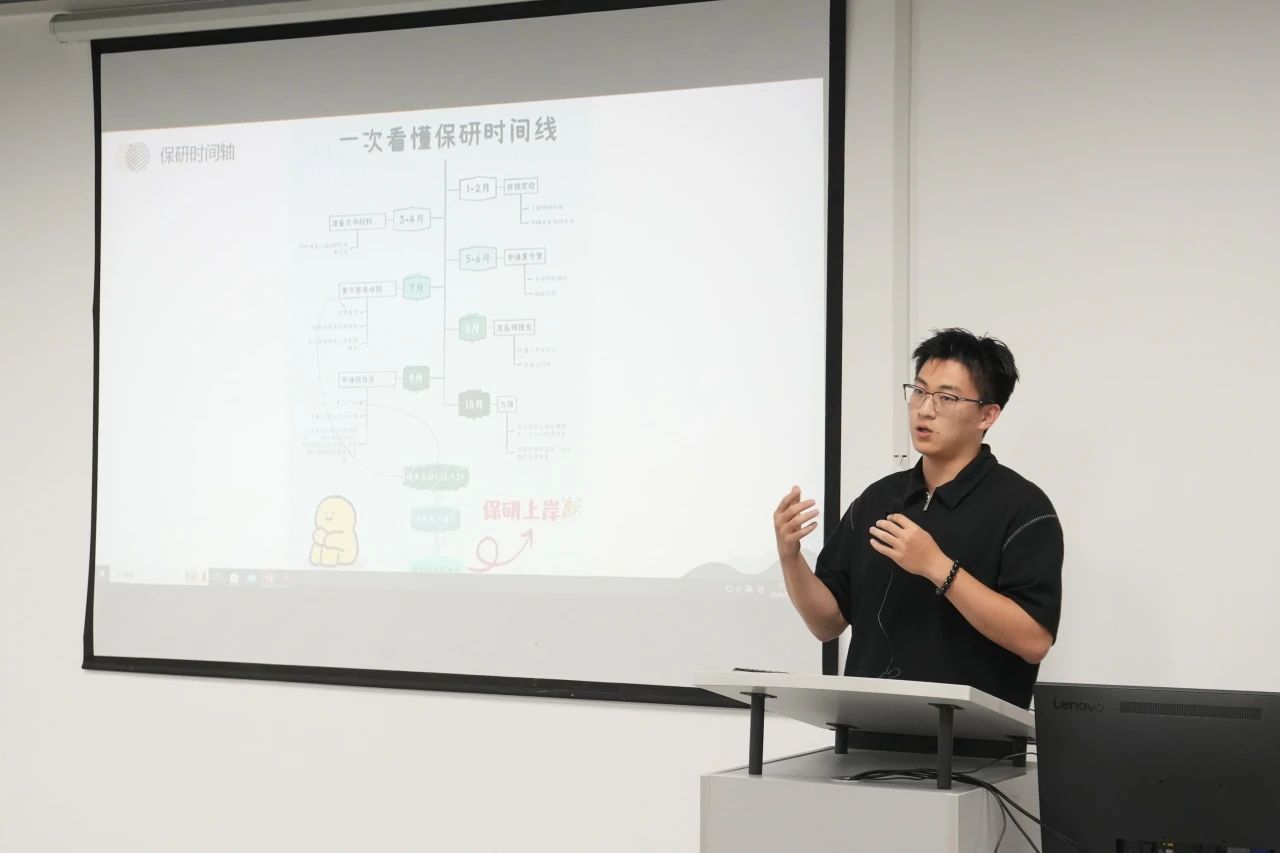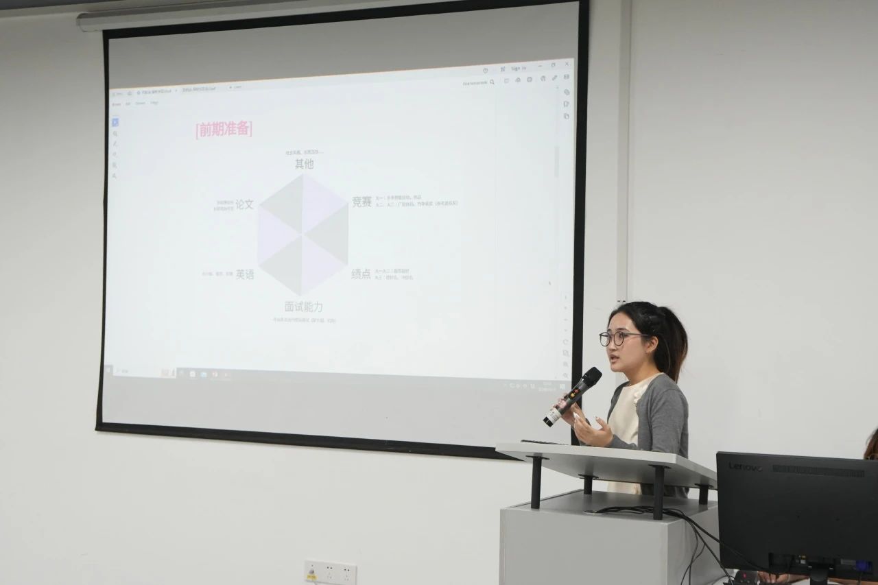 活动伊始,视觉传达设计专业的李佩锦学姐向同学们讲述了保研的时间规划、材料准备和面试准备。她提出要整体的规划时间线,提前了解院校要求,熟悉同期同学水平等意见。向我们分享了她在参加夏令营期间的个人经历。她提醒我们要勇于参与竞赛,积累经验,并从日常作业入手,学会为申请期间作品集的准备作铺垫。