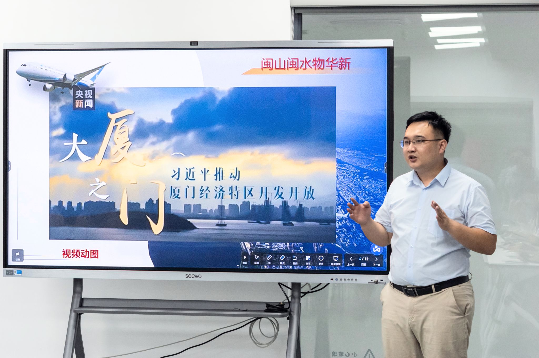 《闽山闽水物华新——习近平福建足迹》一书,生动展现了习近平同志为福建改革开放和现代化建设事业作出的一系列极具前瞻性、开创性、战略性的理念创新和实践探索,充分体现了习近平同志对福建山山水水和父老乡亲的深厚感情。支部书记廖炜选取书中的一个章节,讲授题为《大厦之门,越开越大——厦门经济特区的开放历程》的党课。廖炜以厦门航空公司的发展历程为切入点,为大家讲述了习近平同志在厦门工作期间扩建厦门机场、发展厦门航空等一系列改革开放、经济建设的生动实践。廖炜提到,随着改革开放的不断深入,厦门已日益成为经济蓬勃发展、人民安居乐业、对外交流密切的现代化、国际化城市。