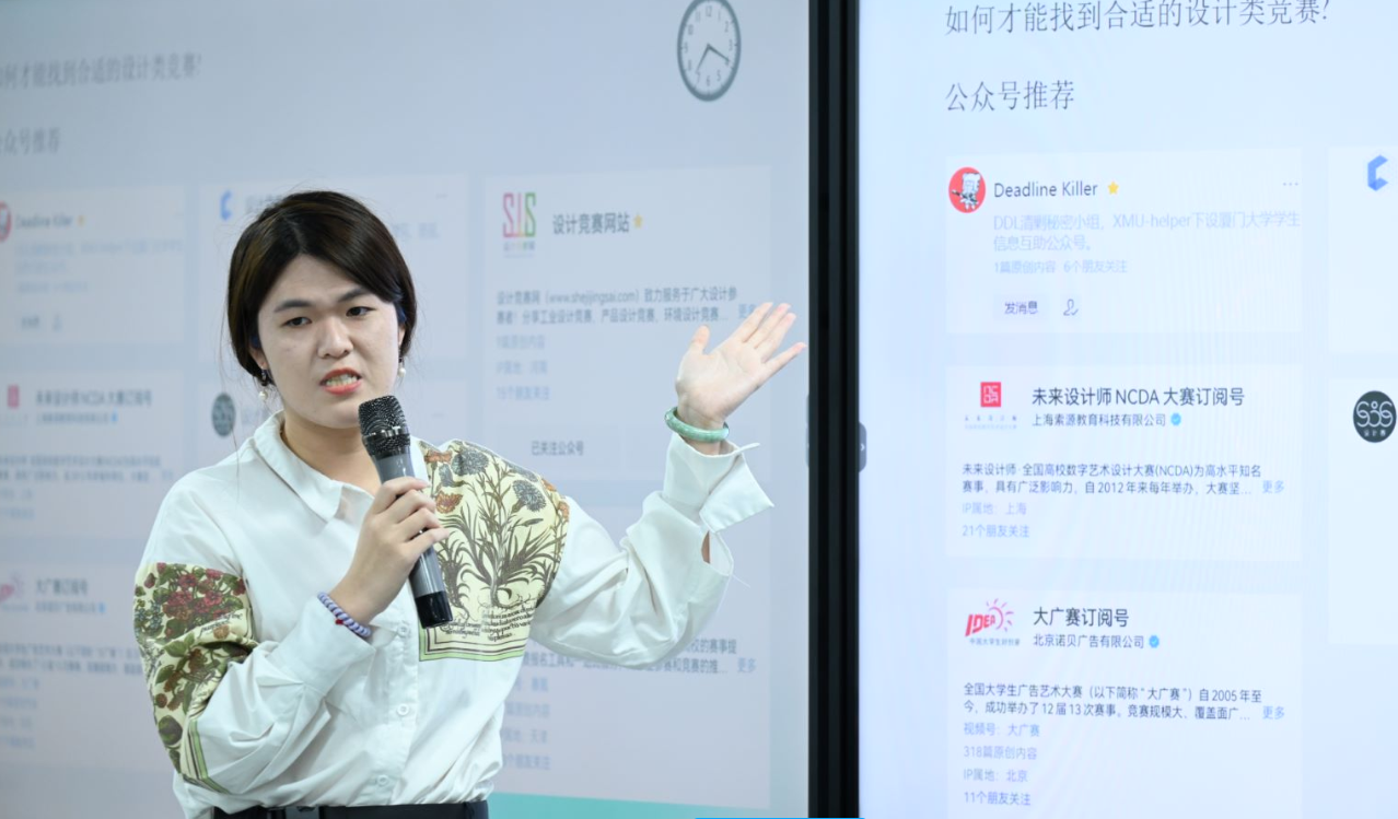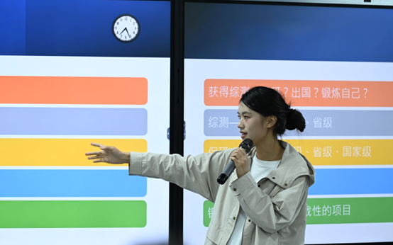 视觉传达设计专业的陈权欣向同学们介绍了我校本科生学业竞赛项目库,归纳了获取科创竞赛的信息渠道,鼓励同学们多参加比赛、多总结经验。