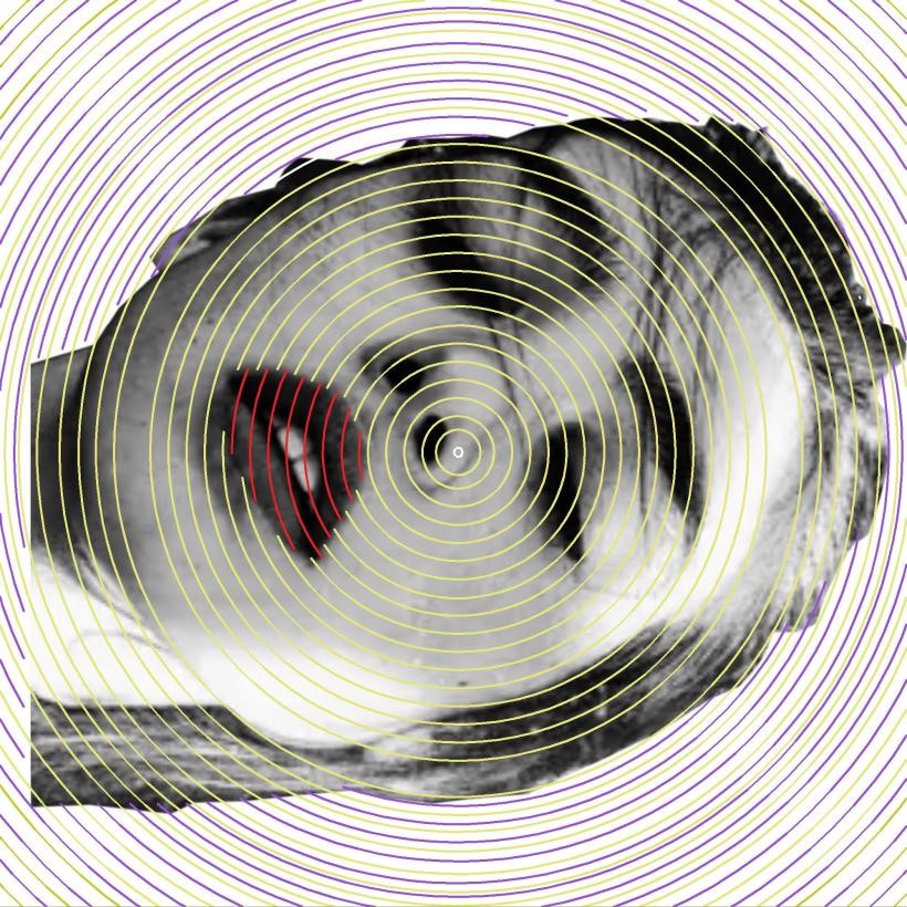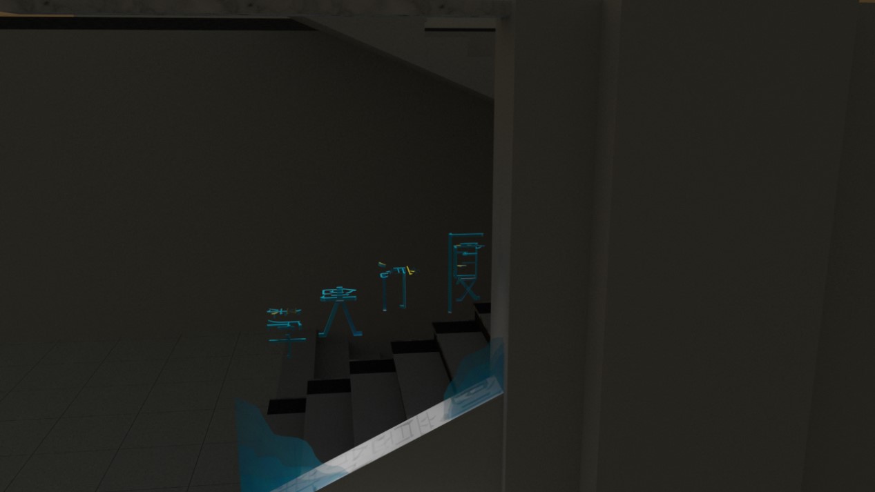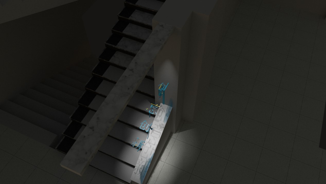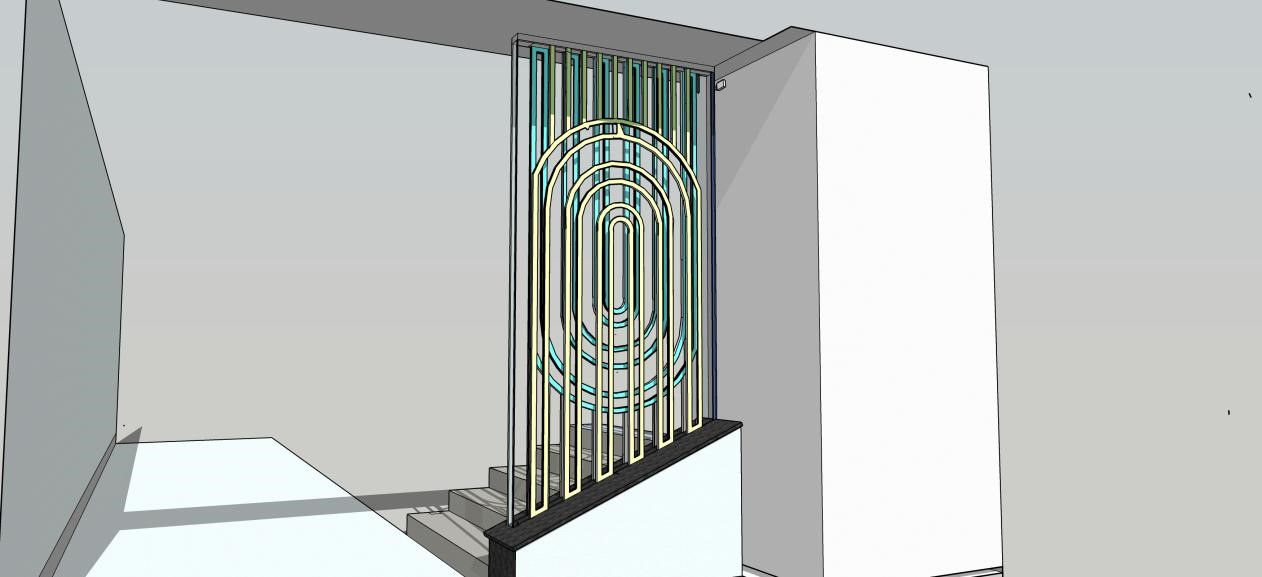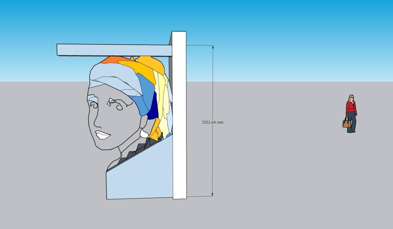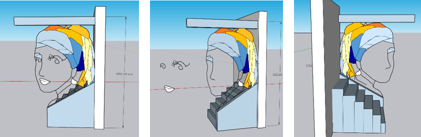 我采用了“视错觉”的设计理念,楼梯的隔断正对着的刚好是一面白墙,我将少女的眼睛和嘴巴都安置于白墙上,所设置在隔断上的就是一整个少女头部的轮廓及标志性的耳环和色彩分明的头巾。从楼梯走上来的人只要站在一定的角度上看就能看出完整的戴珍珠耳环的少女形象。在原画作中,画家采用了全黑的背景,营造出了一种立体的效果,凸显了少女的魅力,仿佛她像黑暗中的一颗钻石一样,闪闪发光。而在我的楼梯隔断设计中,由于对面白墙的映衬,少女完全是置身于白色的背景中了。反之于原画作的浓厚感,展现出的是一种简约与简单的感觉。仿佛少女从遥远的历史长河中翩然走出,带着与生俱来的复古感与现代建筑设计亲密接触。