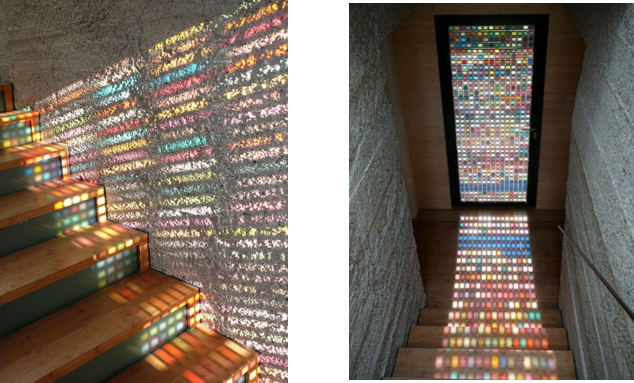 所选色都偏向于复古感与明媚感的结合色,冷暖相配。当有阳光打进来的时候,这些颜色也会映射到对面的白墙上,类似于如图教堂彩窗的折射感。