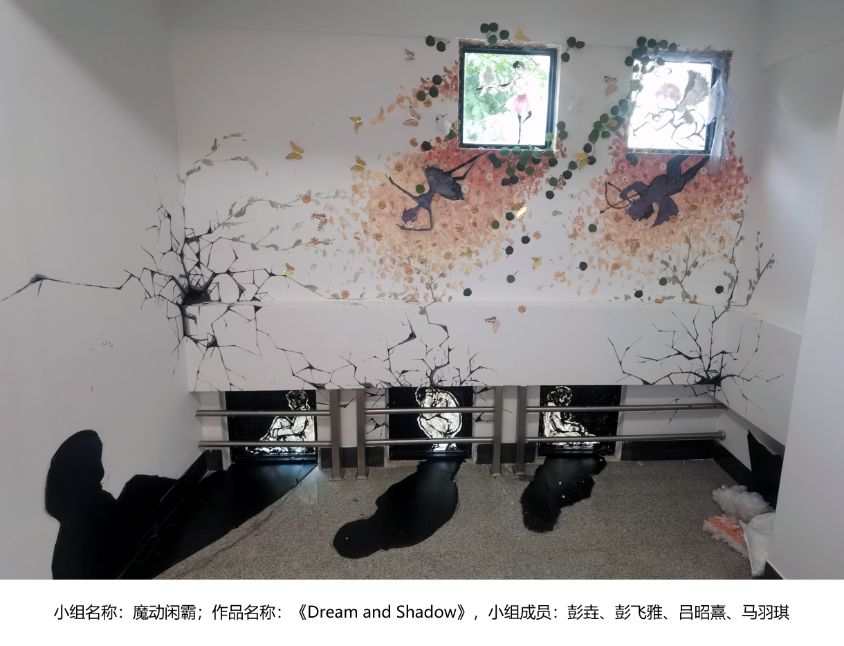 马羽琪、吕昭熹同学:最后一次的任务,对我们来说最值得回忆与骄傲,用老师的话说可能我们之后很少有这样的机会进行多个成员之间的沟通共同创造。课堂中老师通过分析艺术家的空间创作艺术作品,艺术家的作品随着时间、光照射的角度、拍摄位置的不同视觉上产生了非常有趣的变换给了我们启发。我们选择了教学楼二楼与一楼之间的楼道进行创作改造,利用上下两组窗户来制造不同的视觉感受,一种是孤独的黑暗的一面,影子也是全黑的,而上面的窗户则是彩色梦幻的,更多代表对美好的向往。我们想通过影子的不同来表达。我觉得这次的作品创作过程十分吸引我,小组合作也很有意义。但在我自己去尝试的时候,却发现很艰难。从提出方案和找寻满意的地点就花费了我们不少时间,后期的材料购买更是花样百出。通过这次作业我感受到了“梦”的不易与有趣,但也必须得承认这样一份大作业做好的成就感比之前几个个人作业都强。我在此种更感受到了团队的重要,以及对空间的利用有了更深的思考。