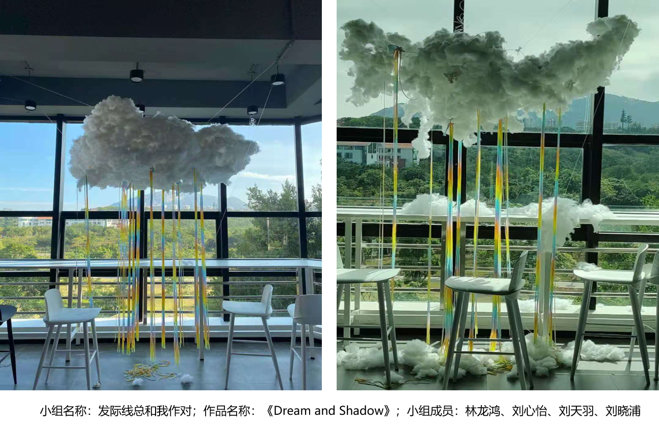 林龙鸿、刘心怡同学:最后的课题是材料与空间,我们的小组在总结了各自的想法之后将大家的想法进行整合,用棉花与气球,制成了一朵白云一朵乌云,在不同的转角位置,给人一种豁朗开朗的感觉,也与主题造型与空间相结合。云朵在源源不断的吐出彩虹时,也在渐渐的消耗自己,梦境的美丽,要的是现实的不断支持……