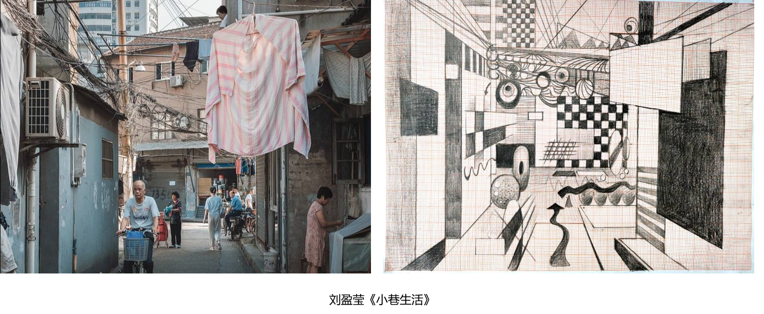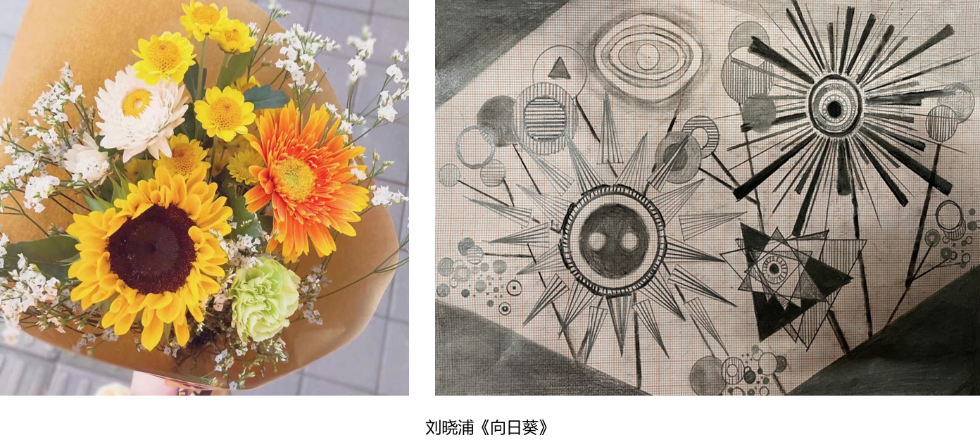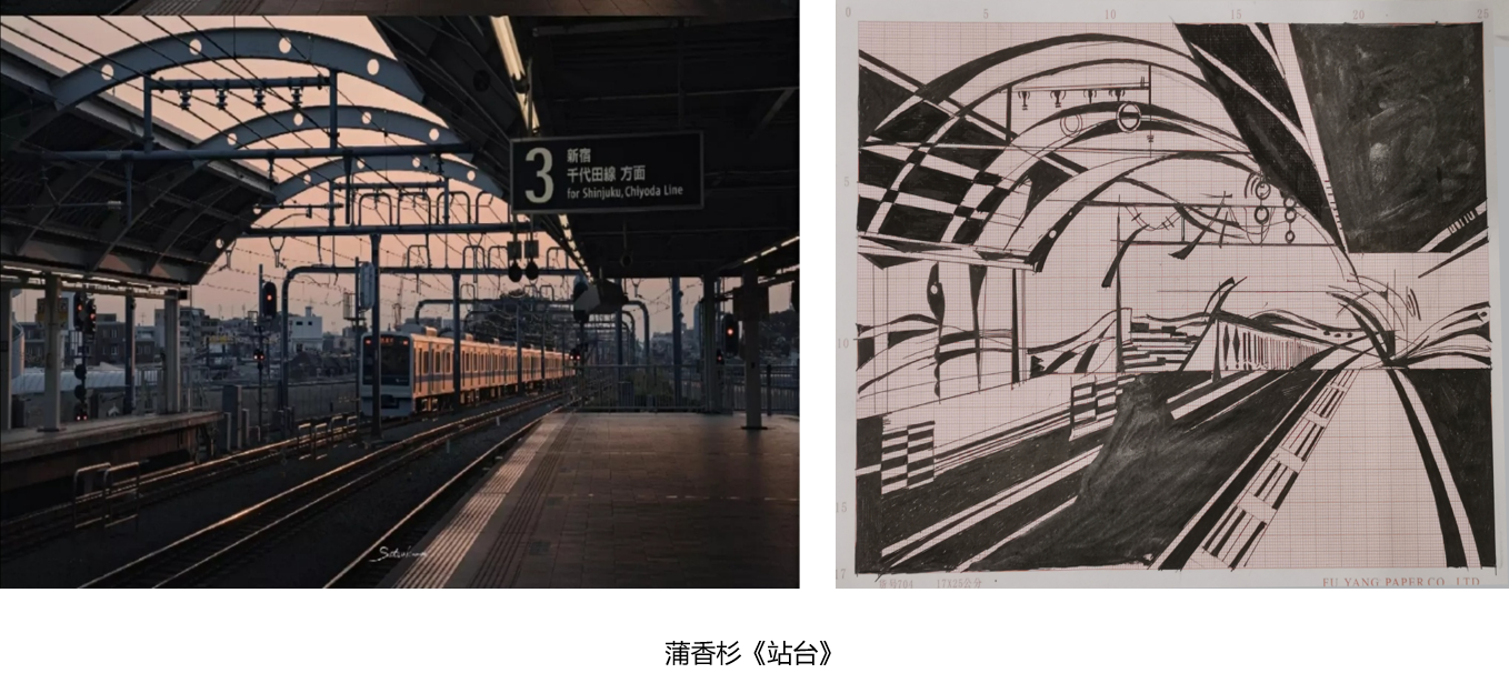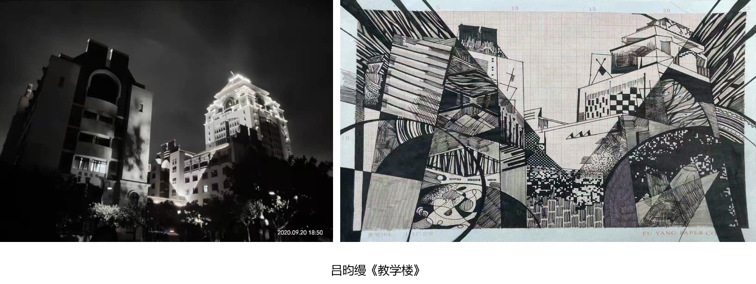 刘晓浦同学:当提到本次作业是自己抽象一副风景或建筑照片时,我又两眼发黑,无力感涌上心头,但毕竟这次是用自己熟悉的工具来作画,少少的熟悉感同时又带来了一份安心。课堂点评时看到同学们全部选择了风景建筑作品后,唯独选择静物作画的我显得格格不入且画面很难被看出与原图的关联性。但我认为作画过程中我收获了很多:用笔的轻重粗细、排版的疏密变化、点线的结合使用,都展示出完全不同的效果,整合度显得十分的重要。
