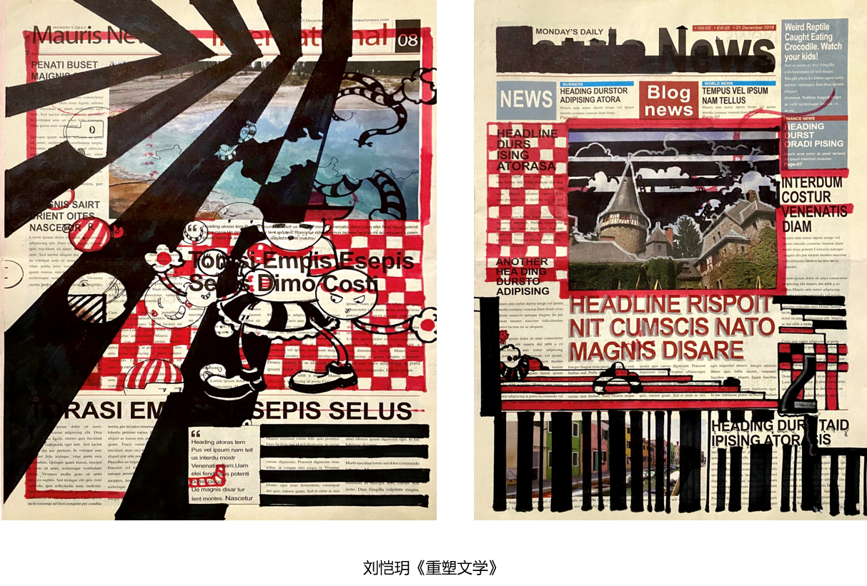 作业:选择报纸、杂志等出版物作为绘画纸,解读文本内容与图像关系,再造新图像。