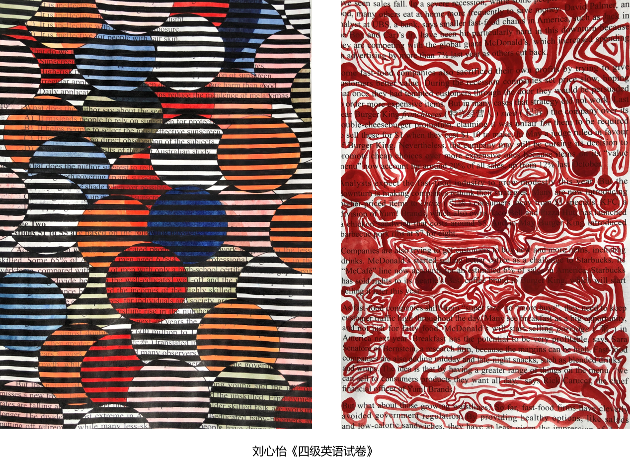 刘心怡同学:书本改造作业中,整本书以高纯度的三原色红黄蓝为主调,进行了彩色绘制。初次接触到这个题目略显茫然,不断盯着书本上的字母发呆。想起中学时期上课无聊时常拿彩笔填涂封闭的字母,便以此为开端,绘制书本的第一页。再到后来翻阅杂志时,看到一位艺术家用单色抽象线条传达出了流动的感觉,便以有关联的单词为开端,摆动尾部,也制造出了流动感。联合文本的圆形图案创造,一张呈现了3D的视觉空间,另一张则是平面绘制。图1绘制时,想到了达芬奇精密的绘画思路,便将数学思维引入画中。连接文本中英文字母i的圆点,并以其中点做垂线形成圆心,作圆。改变了色彩的饱和度与透明度,使画面形成了空间层次。图2受到了波普艺术风格的灵感,大胆使用鲜亮的颜色,用黑色线条区分行间与文本,形成了圆与圆间的交错感。