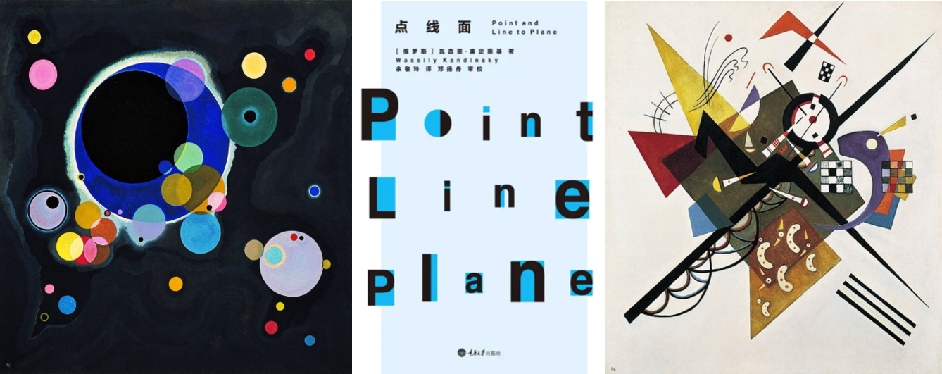 在创意与造型的第二部分内容中,为了让同学们从不同媒介形式语言的角度里去理解最基本的“点线面”问题,课堂讲解首先从康定斯基《点线面》的基础理论以及其作品进行分析,讨论二维平面构成中三大元素点、线、面的视觉语言,以具体分析的方法研究抽象视觉元素的艺术特征。紧接着对点线面的讨论从绘画拓展到了摄影、建筑、书籍设计、产品设计、公共空间、装置与影像等领域中的运用与体现,重点讨论了点线面在各媒介中的展现形式,变相发展,以及空间关系等。