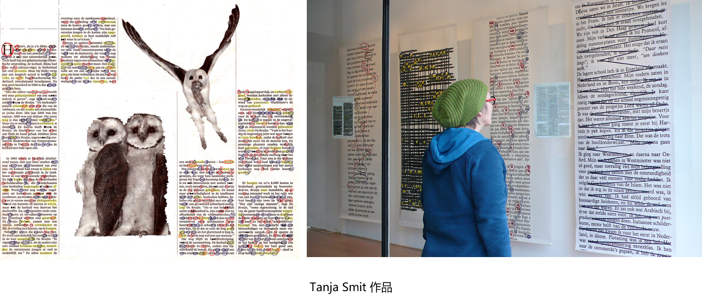在创意与造型的第三部分内容的讨论中,提出了从印刷媒体到数字媒体,从文本到图像的能量转化问题的思考。课堂讲解通过介绍荷兰艺术家Tanja Smit的创作理念以及作品,让同学们思考文本、图像与印刷媒介之间的关系。我们生活在一个图像文化的时代里,大量的图像以极快地速度向我们袭来,而我们并没有学习阅读这些图像。实际上,我们倾向于忘记这些图像是由人有意识地使用图像语言来控制我们。为此,在创作中,更需要深入的研究文本、图像与媒介之间的关系,尝试通过媒介现成品的再改造来弥合现实与我们对现实的感知之间的鸿沟。