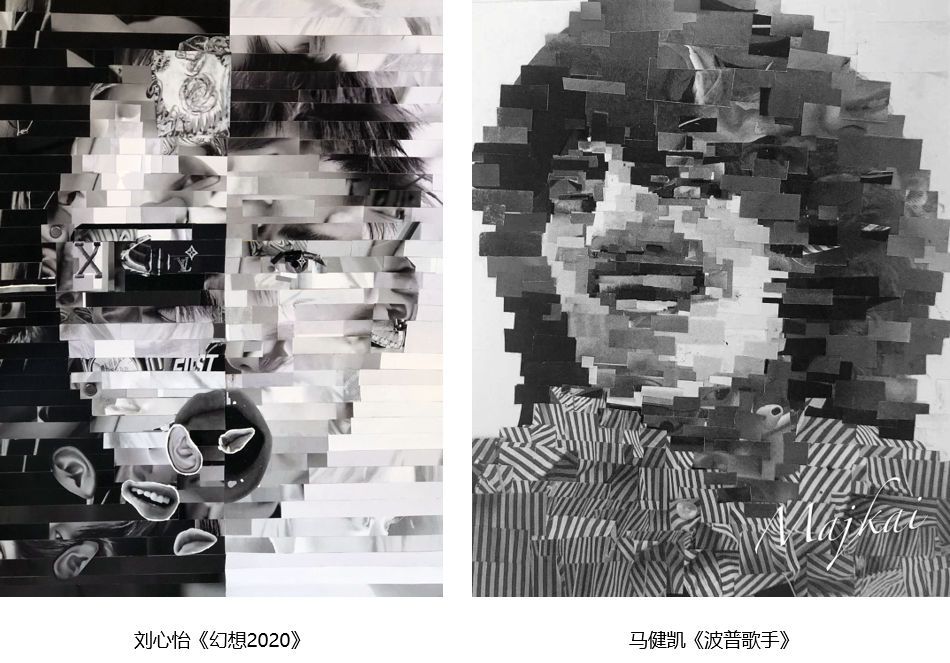 马健凯同学:通过打印人像照片来创造出新的肖像,对我来说这是一种新的表达方式的尝试。我将所有照片裁剪成1厘米宽的小条,并将他们看成一个个色块,或者说是像素点。有了这样的感受,我选择了像素画的方式来表达。在拼贴的时候兼顾了光影与体积的关系表达,创造出了一个长发男歌手的形象。这个形象代表了我对自己未来形象的向往,表达了我内心中自己的形象。这次的创作我学会了将固有信息、图像碎片化,让我可以不受原先形体特征的限制,创造出属于自己的新想象。