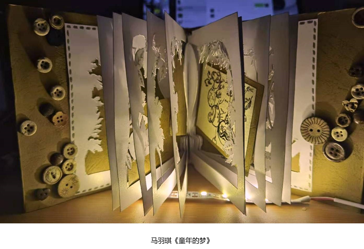 马羽琪同学:这个星期老师分析了Maria Lia作品,她将她的情感都汇集于一种材料中并且通过制成一本书的方式表达出来。我感到格外的新奇,材料的运用一改纸上创造的局限,使之富有更多的趣味性与意义性。我的作业选择了剪纸来表达我的童年,因为在我小时候和妈妈参加剪纸比赛很让我记忆深刻,和外婆学习剪纸也是一件很有意义的事情,所以我想通过剪纸来表达我童年美好的梦。其次,我也想用相册来体现回忆的话题,因为在我的感知中,回忆总是藏在相册里。在做这次作业时,可能是由于回忆,我有了更深的感触,发现材料本身可以比文字更有意义,有很多文字匮乏表达的,但它却可以系一份感情,也使设计有更多的展现方式。这不但突破了材料的边界,更突破了我“梦”的边界。