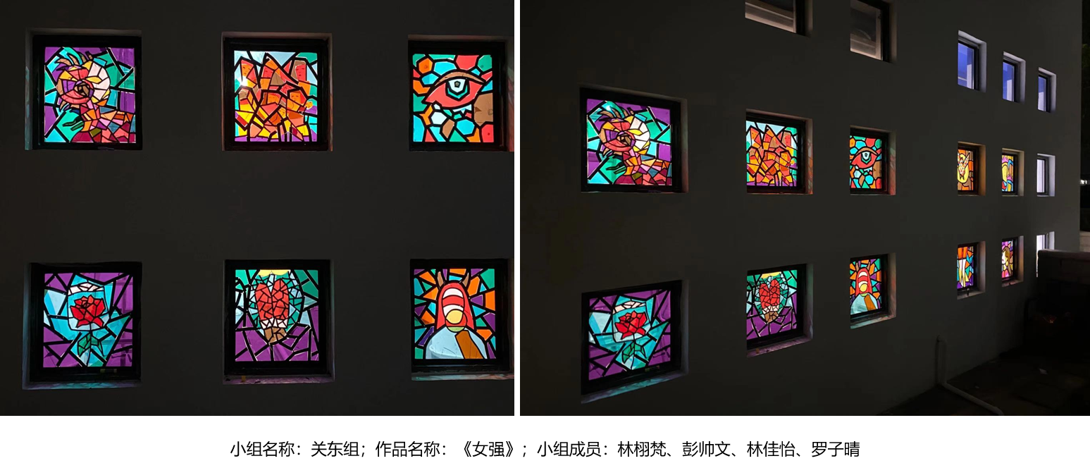 彭帅文、林佳怡同学:本周通过造型与空间的学习,综合前几周课程,进行小组作业。作品以教堂窗花为创作灵感,运用玻璃纸、黑胶带,碎片化原有的图案,讨论了关于女权的开发性主题。作品从黑暗到光明,从冷色调到暖色调的变化,表达了女性追求平等和解放人权的抗争过程。