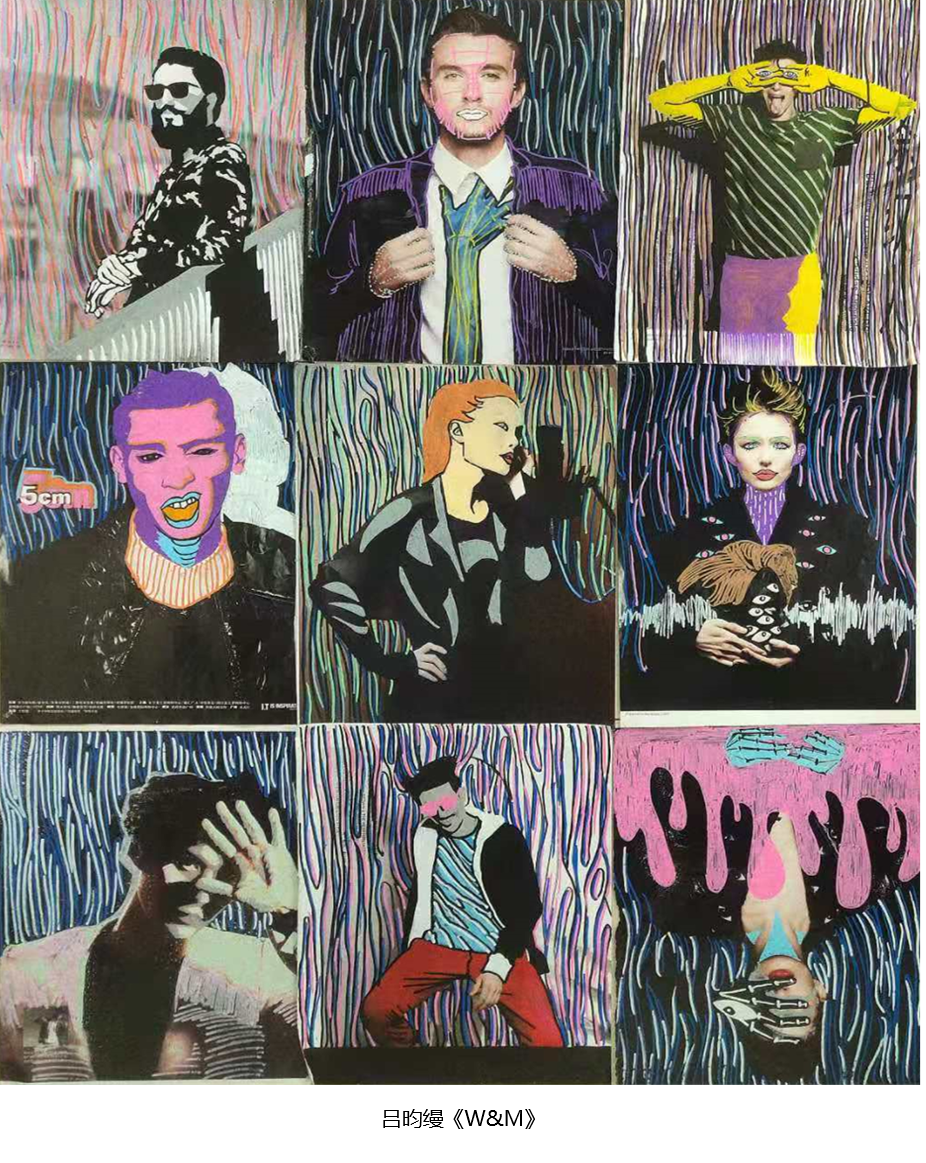 吕昀缦同学:第三周的作业是改造。杂志的类型多种多样,我做的《W&M》是以人为主体的系列,在这个作品中没有男人女人之分,不管男女我都用了相同的处理手法,体现“人”的整体,所有的背景都统一使用线条处理,同时这个作品也是我自己创新的大胆尝试,对于人的五官不知该如何进行改造,我尝试使用鲜艳的强烈对比的颜色覆盖人脸部的亮面和暗面,最终成为了不像人的人,借此灵感创作了这一系列,使整体的效果十分强烈,给人视觉产生冲击力。