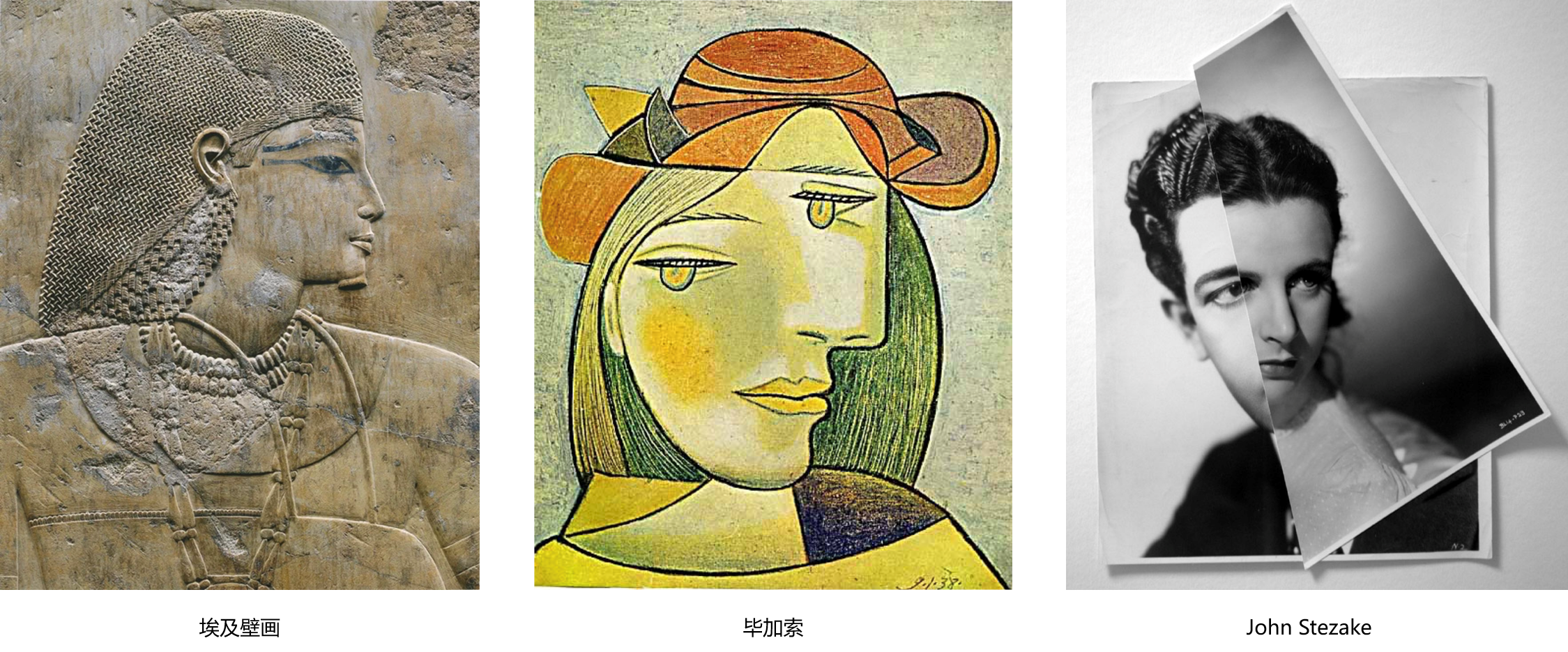 第一个板块“创意与造型”,分为三个部分递进。首先为了打破学生们入学前固有的造型思维习惯,课程讲解过程中从三个不同历史时间段里抽取出截然不同的三种艺术作品,分别是:埃及壁画、毕加索、John Stezaker,进行对比、比较、分析和讨论,并要求大家重点思考三种艺术作品在造型方面的特点与联系。
