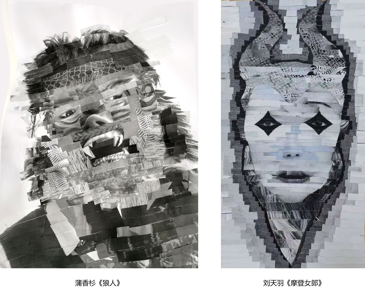 刘盈莹同学:还记得第一次上造型课的那天,我带着速写板和一堆铅笔、炭笔来到了上课的教室,以为自己将要面临第二个像高三一样没有尽头的美术集训,或许是高中集训对我造成的不良影响,我下意识地认为“造型课”的意思就是写实、素描、水彩。事实上,在艺术的范畴中,造型与设计是没有边界的。这是我上造型课学到的第一点。我们的第一次作业是拼贴人像“人造人”。这对我来说不仅是大学里的第一次,也是人生的第一次——我从未完成过这种形式的作品。一开始我感到迷茫,没有了画笔和橡皮擦,我该怎么做?我们唯一的材料就是一张当作底面的卡纸和自己挑选的30多张完整的人像。现在回想起来,这大概就是老师教我们跳出画笔局限的第一步吧。