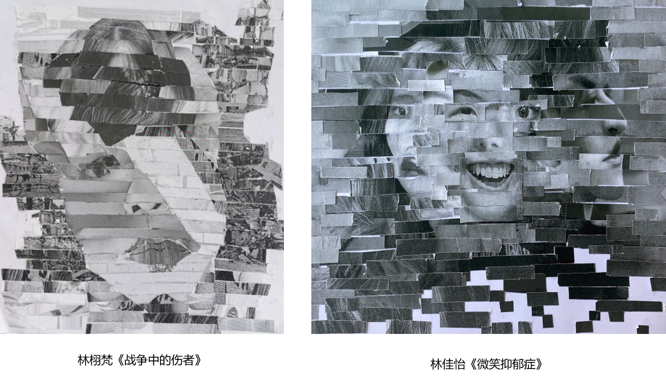 林佳怡同学:第一周的作品通过剪切30位人像照片,并重组拼贴条状组成一幅新的作品。我贴出三位人像的转变,情绪的变化,画面黑白灰的转化,表达出一个人的多个方面,多种情绪。我的灵感来源于“微笑抑郁症”,作为一个正常人,面对生活,我们又何尝不是戴着微笑的面具,隐匿在人群中,但在笑容的背后可能是不为人知的痛苦与哀伤,承受着煎熬。我运用了破碎的方式结束了画面,表示着人们在快乐与悲伤中挣扎,“破碎”的那一刻,感到沮丧、恐惧、焦灼,当我们重新将碎片聚合,我们就又离成长更近了一步。