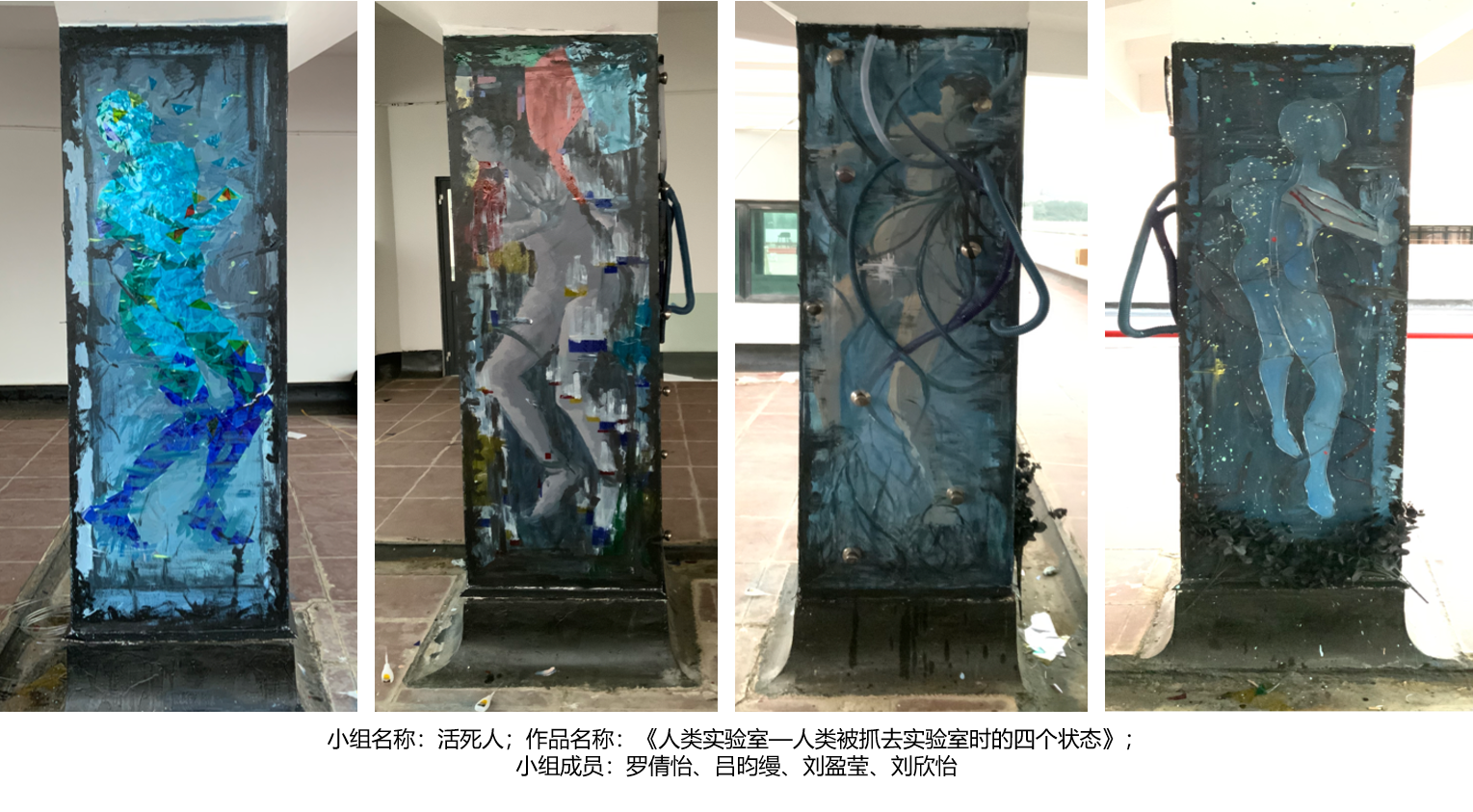 吕昀缦、罗倩怡同学:这次的作业是关于空间与造型,也是我们WOKEN DAY的第一次团队合作作业。我们利用的是院楼天台上的一根柱子,由透过头顶玻璃的光得到灵感我们把它设计成受光面和背光面。这个作品的主题是人体实验,我们将柱子设计成一个人体实验器皿,四个不同的面展现四个不同的受光程度、不同的人物心情、不同的人物形态、不同的表现方式。正面是亮面,表达了“好奇”,用彩色的玻璃蒙版展现人物形象,表现最开始时人对一切未知的好奇和兴奋。第二面是“挣扎”,通过故障效果的展示,表现的是人察觉后的反抗和无谓的挣扎。背面是“束缚”,这一面我们用了很多的工业材料辅助做出立体真实的效果,展现人被缠住被束缚。最后一面是“绝望”,我们选择了悲惨的结局,人挣扎无果后的绝望。这件作品展现的是一个过程,带给人的思考是可变的。我们将光影带入到作业中去,不管是为主还是为辅,它的作用是时小时大,都给我们的作业带来或多或少的帮助,因此也让我更加深入的了解到了光影,对它有了更新的认识。