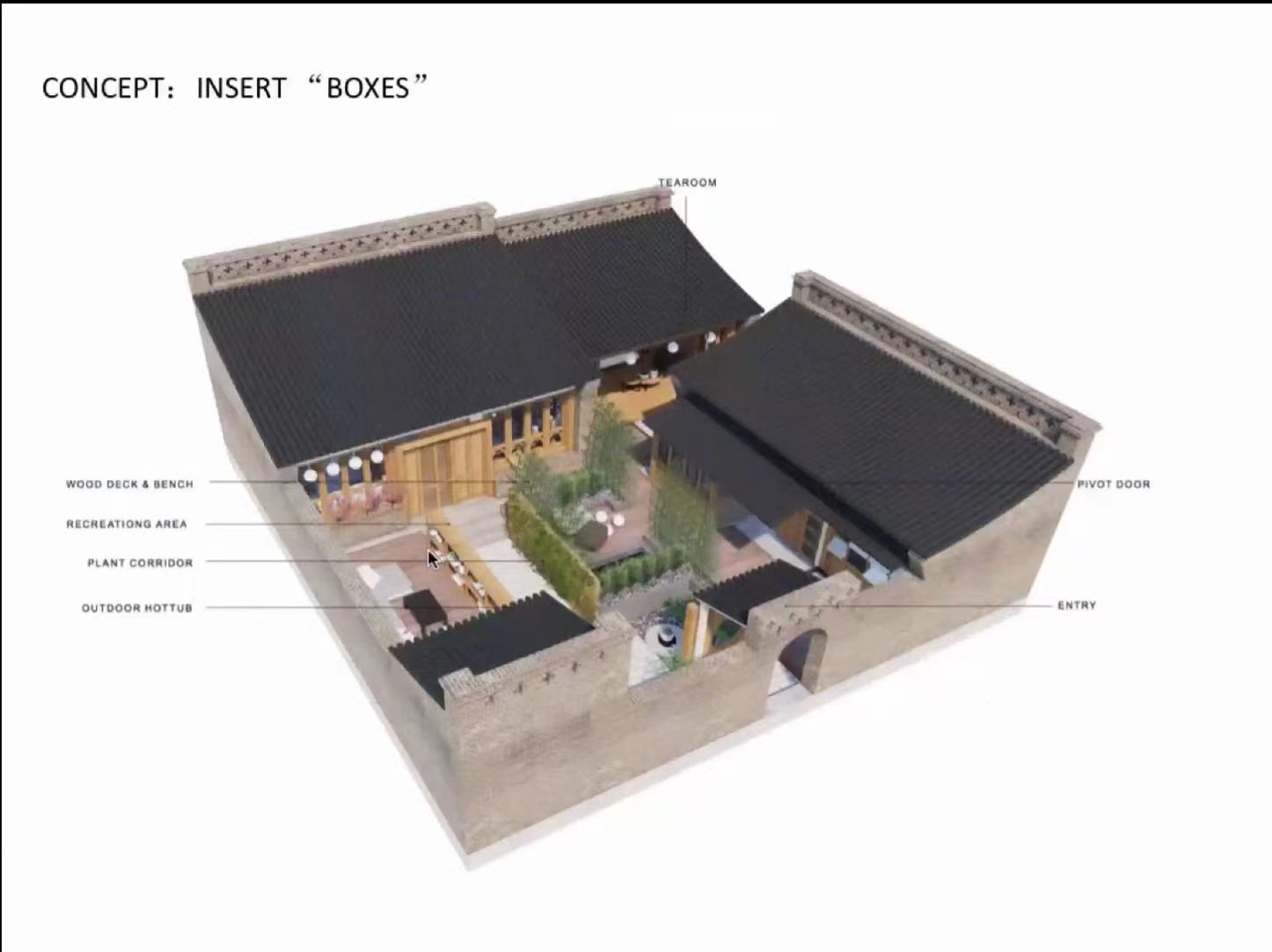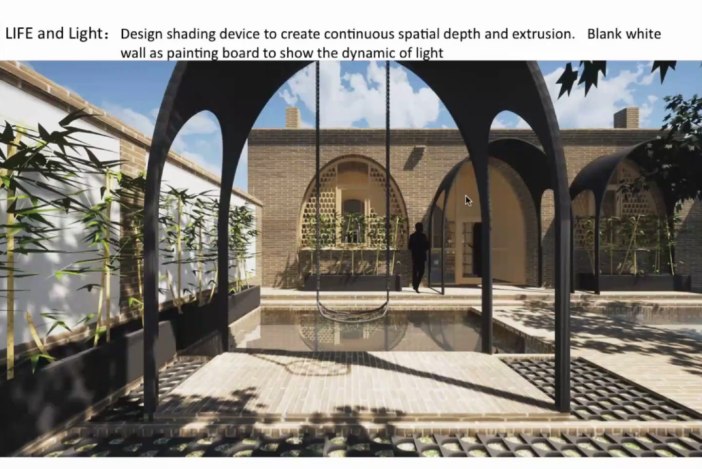 孙小暖老师指出民宿与酒店的区别在于故事感。建筑应该为人的情感服务,好的建筑要能让人记住,可以激发情感。她引用了木瓜村野奢民宿设计的方案进行探讨。它的设计中注重动与静的结合、荒凉与活力的结合,以及材料与感官的结合,创建新旧结合的共生关系。用植物与光让空间变得有层次与生命力,避免用很多的元素但同时保留当地建筑的典型拱形的几何感特点,并强化它,突出空间的亲和力和层次感。